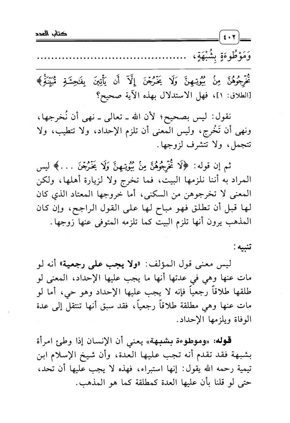 ثم إن قوله: {لاَ تُخْرِجُوهُنَّ مِنْ بُيُوتِهِنَّ وَلاَ يُخْرَجْنَ} ... } ليس المراد به أننا نلزمها البيت، فما تخرج ولا لزيارة أهلها، ولكن المعنى لا تخرجوهن من السكنى، أما خروجها المعتاد الذي كان لها قبل أن تطلق فهو مباح لها على القول الراجح، وإن كان المذهب يرون أنها تلزم البيت كما تلزمه المتوفى عنها زوجها.