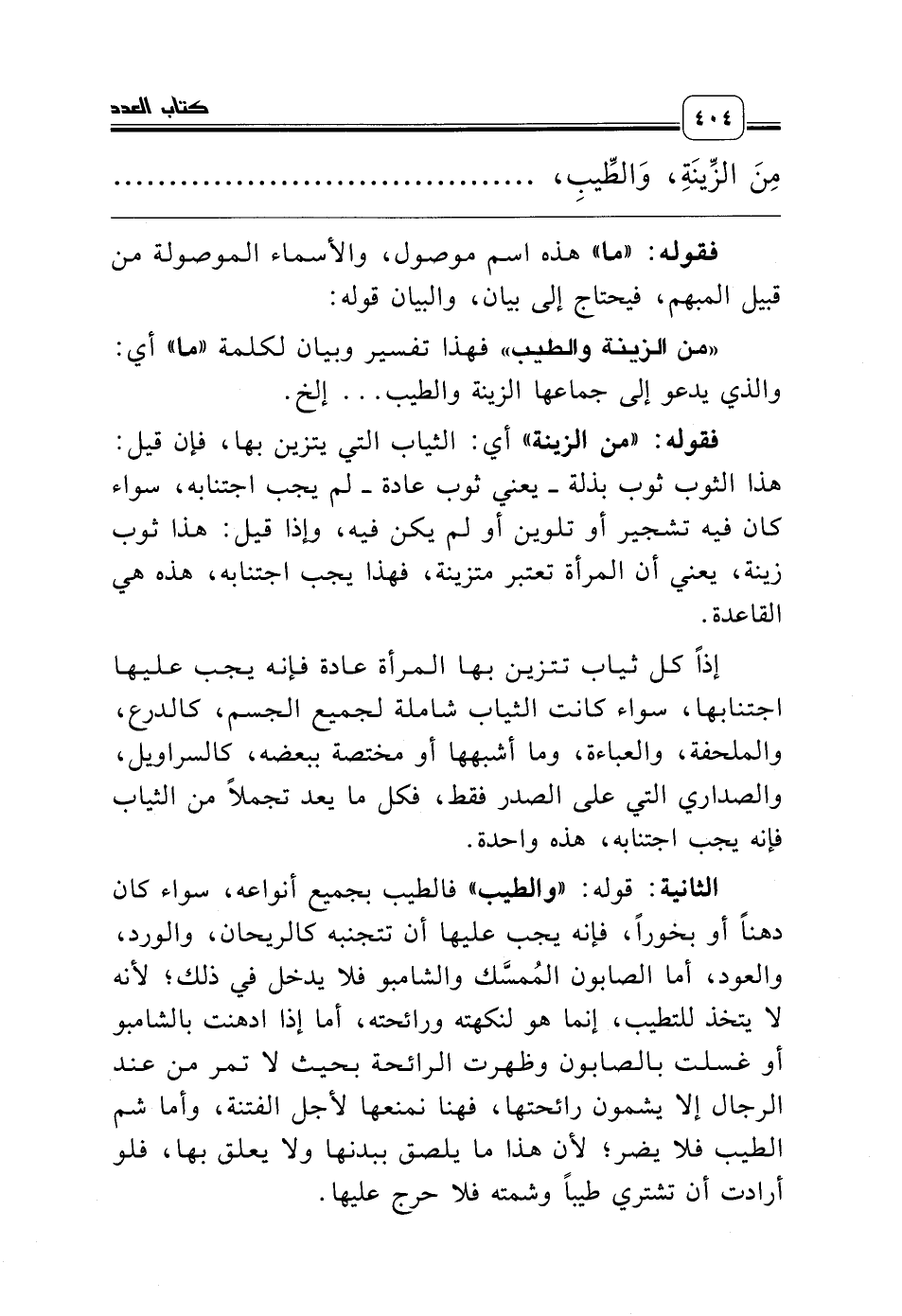 الثانية: قوله: «والطيب» فالطيب بجميع أنواعه، سواء كان دهناً أو بخوراً، فإنه يجب عليها أن تتجنبه كالريحان، والورد، والعود، أما الصابون المُمسَّك والشامبو فلا يدخل في ذلك؛ لأنه لا يتخذ للتطيب، إنما هو لنكهته ورائحته، أما إذا ادهنت بالشامبو أو غسلت بالصابون وظهرت الرائحة بحيث لا تمر من عند الرجال إلا يشمون رائحتها، فهنا نمنعها لأجل الفتنة، وأما شم الطيب فلا يضر؛ لأن هذا ما يلصق ببدنها ولا يعلق بها، فلو أرادت أن تشتري طيباً وشمته فلا حرج عليها.