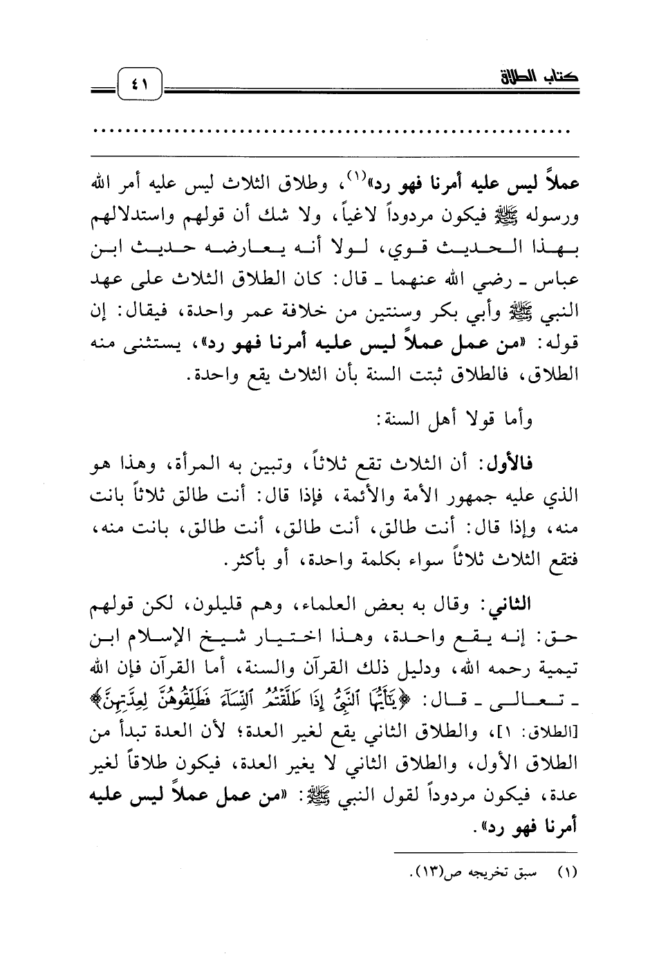عملاً ليس عليه أمرنا فهو رد» (¬1)، وطلاق الثلاث ليس عليه أمر الله ورسوله صلّى الله عليه وسلّم فيكون مردوداً لاغياً، ولا شك أن قولهم واستدلالهم بهذا الحديث قوي، لولا أنه يعارضه حديث ابن عباس ـ رضي الله عنهما ـ قال: كان الطلاق الثلاث على عهد النبي صلّى الله عليه وسلّم وأبي بكر وسنتين من خلافة عمر واحدة، فيقال: إن قوله: «من عمل عملاً ليس عليه أمرنا فهو رد»، يستثنى منه الطلاق، فالطلاق ثبتت السنة بأن الثلاث يقع واحدة.