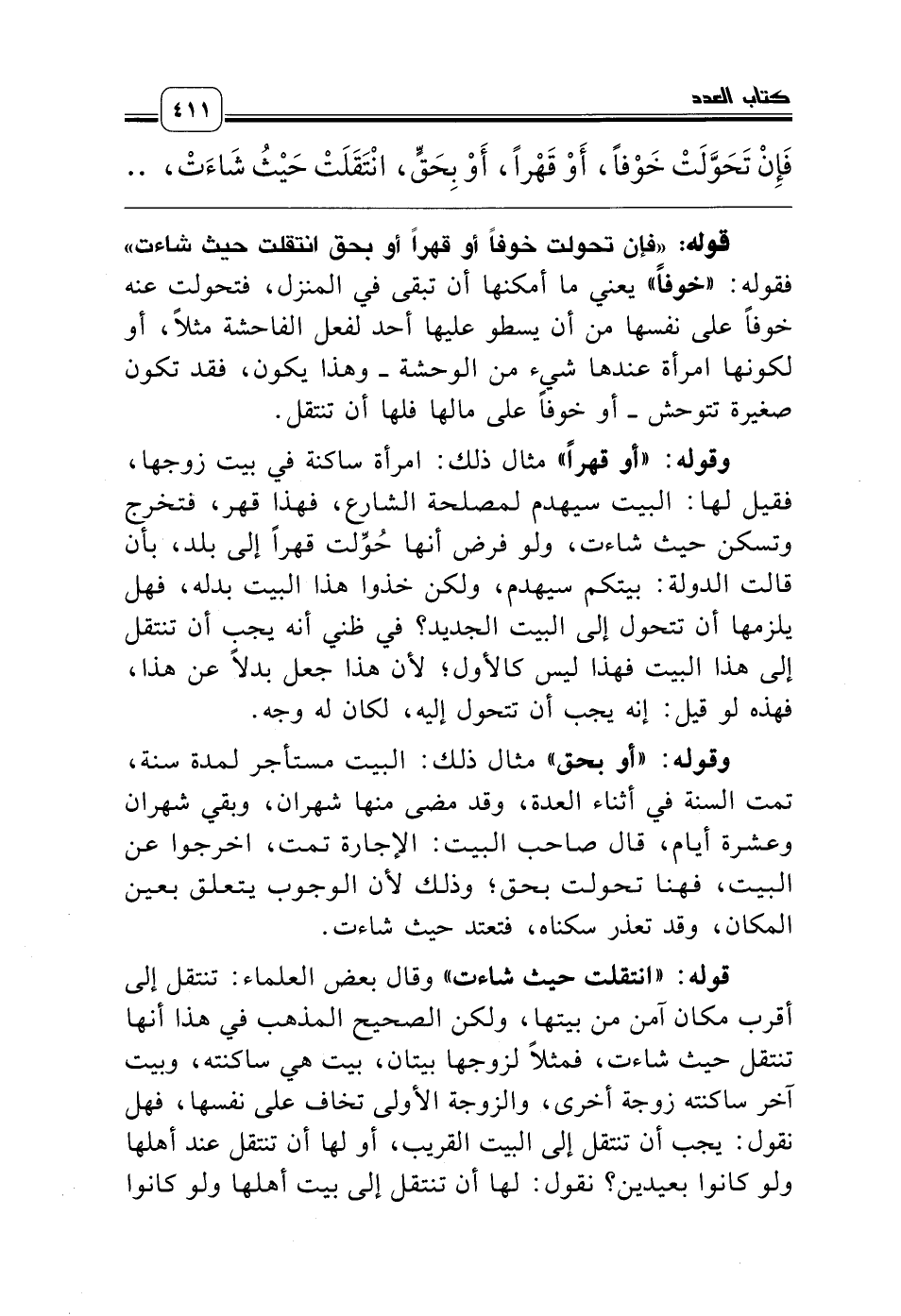 وقوله: «أو قهراً» مثال ذلك: امرأة ساكنة في بيت زوجها، فقيل لها: البيت سيهدم لمصلحة الشارع، فهذا قهر، فتخرج وتسكن حيث شاءت، ولو فرض أنها حُوِّلت قهراً إلى بلد، بأن قالت الدولة: بيتكم سيهدم، ولكن خذوا هذا البيت بدله، فهل يلزمها أن تتحول إلى البيت الجديد؟ في ظني أنه يجب أن تنتقل إلى هذا البيت فهذا ليس كالأول؛ لأن هذا جعل بدلاً عن هذا، فهذه لو قيل: إنه يجب أن تتحول إليه، لكان له وجه.