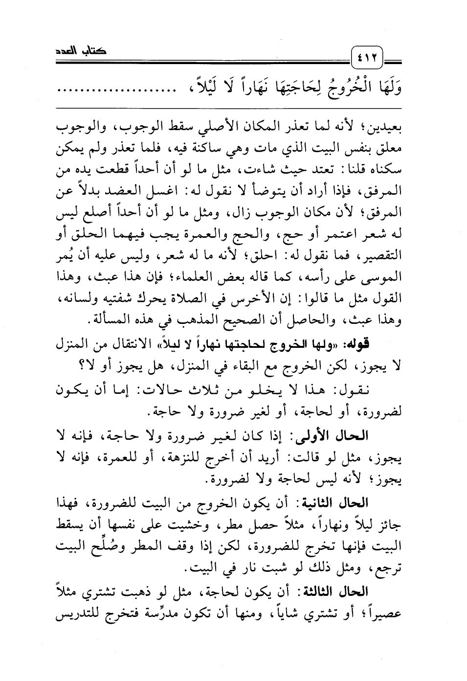 الحال الثانية: أن يكون الخروج من البيت للضرورة، فهذا جائز ليلاً ونهاراً، مثلاً حصل مطر، وخشيت على نفسها أن يسقط البيت فإنها تخرج للضرورة، لكن إذا وقف المطر وصُلِّح البيت ترجع، ومثل ذلك لو شبت نار في البيت.