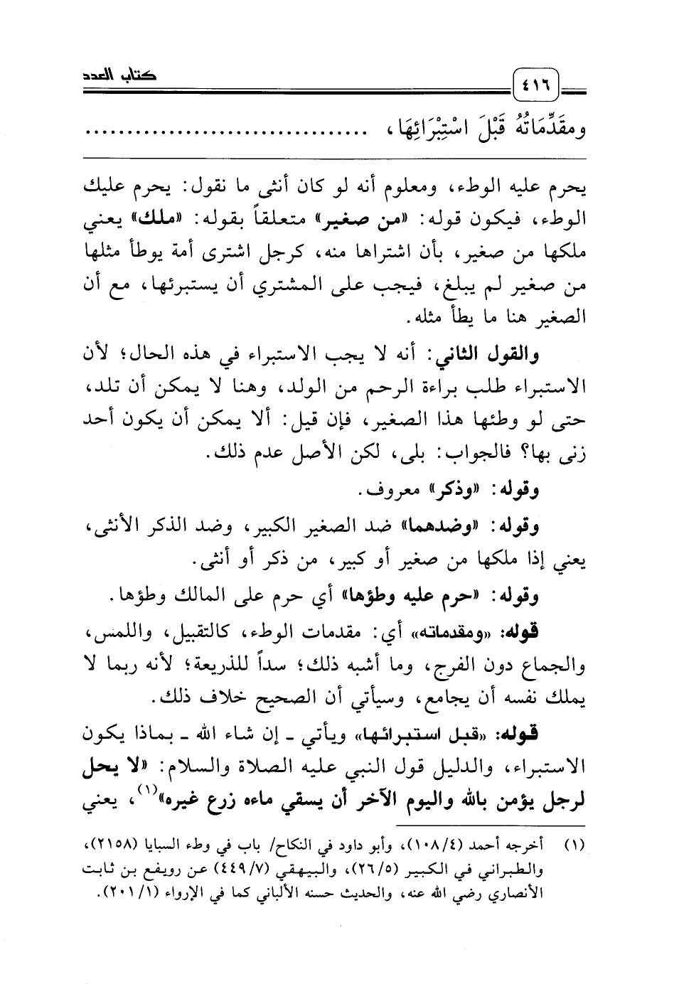 (¬1) أخرجه أحمد (4/ 108)، وأبو داود في النكاح/ باب في وطء السبايا (2158)، والطبراني في الكبير (5/ 26)، والبيهقي (7/ 449) عن رويفع بن ثابت الأنصاري رضي الله عنه، والحديث حسنه الألباني كما في الإرواء (1/ 201).