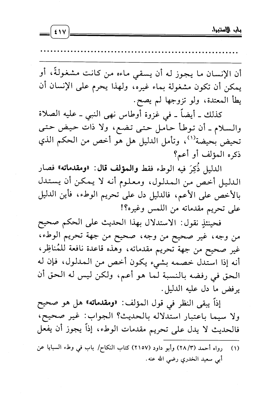 فحينئذٍ نقول: الاستدلال بهذا الحديث على الحكم صحيح من وجه، غير صحيح من وجه، صحيح من جهة تحريم الوطء، غير صحيح من جهة تحريم مقدماته، وهذه قاعدة نافعة للمُناظِر، أنه إذا استدل خصمه بشيء يكون أخص من المدلول، فإن له الحق في رفضه بالنسبة لما هو أعم، ولكن ليس له الحق أن يرفض ما دل عليه الدليل.