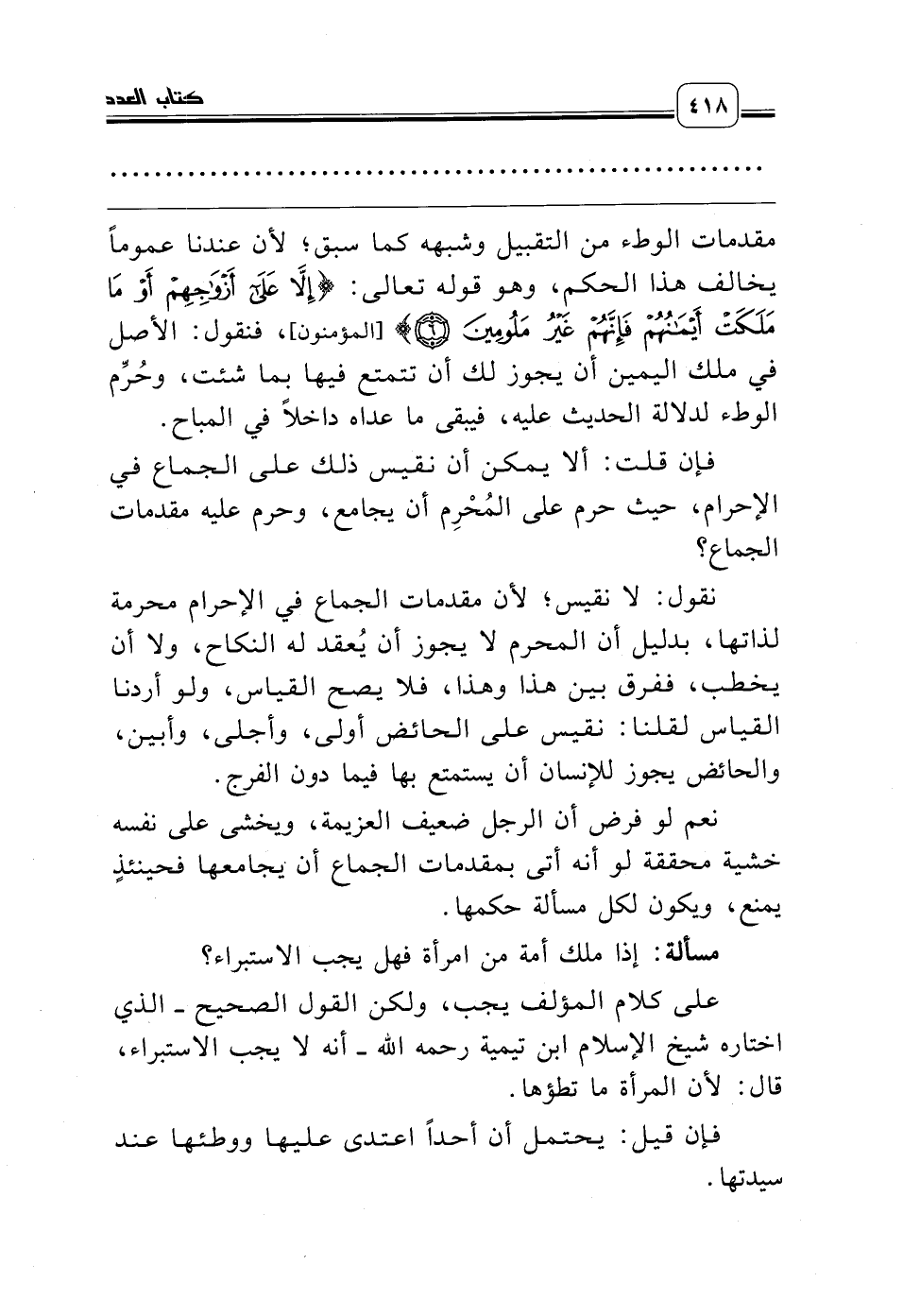 مقدمات الوطء من التقبيل وشبهه كما سبق؛ لأن عندنا عموماً يخالف هذا الحكم، وهو قوله تعالى: {إِلاَّ عَلَى أَزْوَاجِهِمْ أَوْ مَا مَلَكَتْ أَيْمَانُهُمْ فَإِنَّهُمْ غَيْرُ مَلُومِينَ} [المؤمنون 6]، فنقول: الأصل في ملك اليمين أن يجوز لك أن تتمتع فيها بما شئت، وحُرِّم الوطء لدلالة الحديث عليه، فيبقى ما عداه داخلاً في المباح.