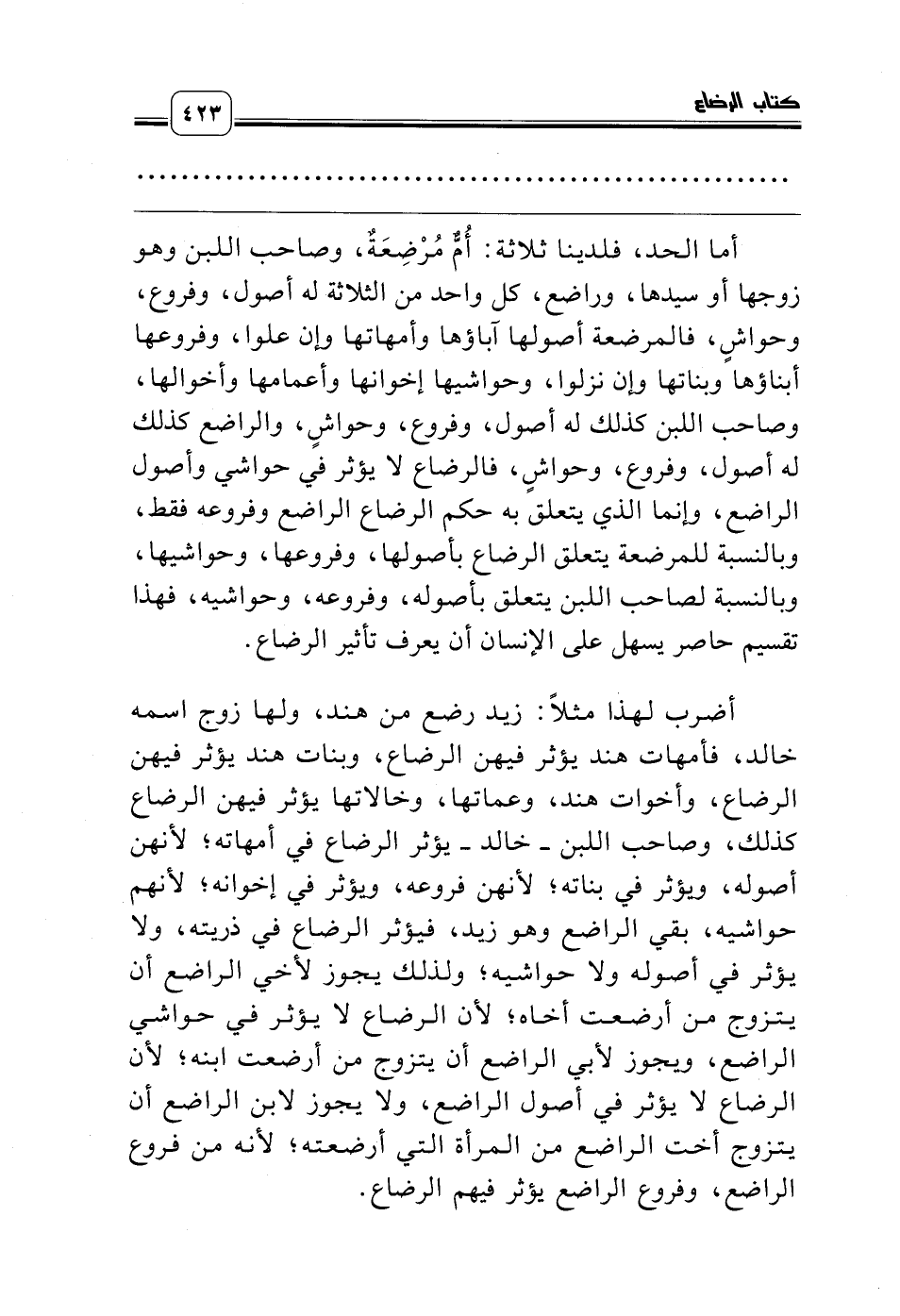 أضرب لهذا مثلاً: زيد رضع من هند، ولها زوج اسمه خالد، فأمهات هند يؤثر فيهن الرضاع، وبنات هند يؤثر فيهن الرضاع، وأخوات هند، وعماتها، وخالاتها يؤثر فيهن الرضاع كذلك، وصاحب اللبن ـ خالد ـ يؤثر الرضاع في أمهاته؛ لأنهن أصوله، ويؤثر في بناته؛ لأنهن فروعه، ويؤثر في إخوانه؛ لأنهم حواشيه، بقي الراضع وهو زيد، فيؤثر الرضاع في ذريته، ولا يؤثر في أصوله ولا حواشيه؛ ولذلك يجوز لأخي الراضع أن يتزوج من أرضعت أخاه؛ لأن الرضاع لا يؤثر في حواشي الراضع، ويجوز لأبي الراضع أن يتزوج من أرضعت ابنه؛ لأن الرضاع لا يؤثر في أصول الراضع، ولا يجوز لابن الراضع أن يتزوج أخت الراضع من المرأة التي أرضعته؛ لأنه من فروع الراضع، وفروع الراضع يؤثر فيهم الرضاع.