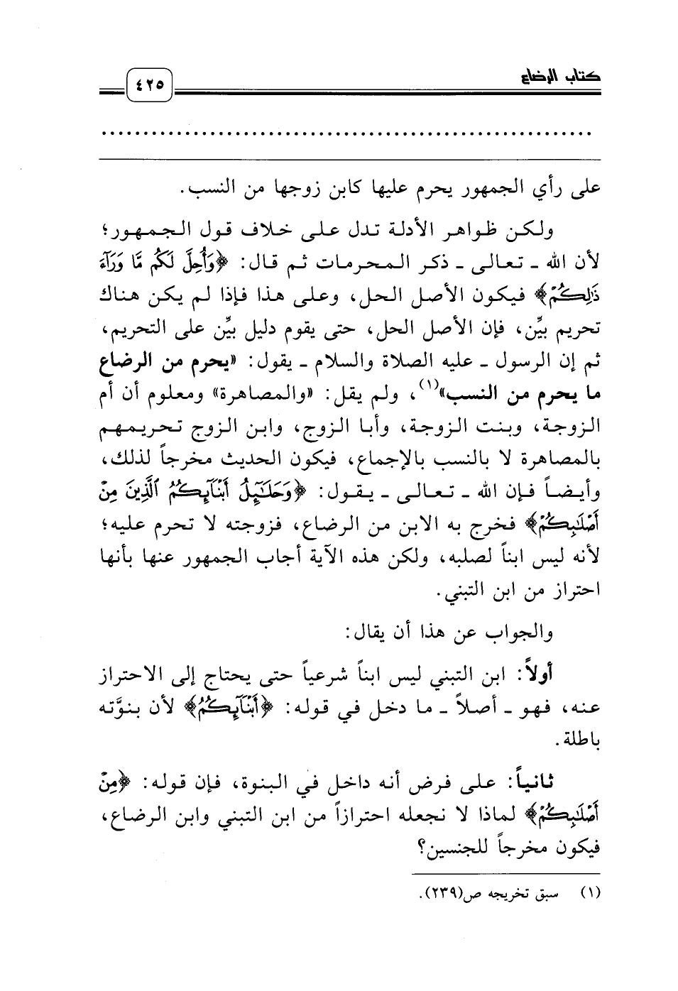 ولكن ظواهر الأدلة تدل على خلاف قول الجمهور؛ لأن الله ـ تعالى ـ ذكر المحرمات ثم قال: {وَأُحِلَّ لَكُمْ مَا وَرَاءَ ذَلِكُمْ} فيكون الأصل الحل، وعلى هذا فإذا لم يكن هناك تحريم بيِّن، فإن الأصل الحل، حتى يقوم دليل بيِّن على التحريم، ثم إن الرسول ـ عليه الصلاة والسلام ـ يقول: «يحرم من الرضاع ما يحرم من النسب» (¬1)، ولم يقل: «والمصاهرة» ومعلوم أن أم الزوجة، وبنت الزوجة، وأبا الزوج، وابن الزوج تحريمهم بالمصاهرة لا بالنسب بالإجماع، فيكون الحديث مخرجاً لذلك، وأيضاً فإن الله ـ تعالى ـ يقول: {وَحَلاَئِلُ أَبْنَائِكُمُ الَّذِينَ مِنْ أَصْلاَبِكُمْ} فخرج به الابن من الرضاع، فزوجته لا تحرم عليه؛ لأنه ليس ابناً لصلبه، ولكن هذه الآية أجاب الجمهور عنها بأنها احتراز من ابن التبني.