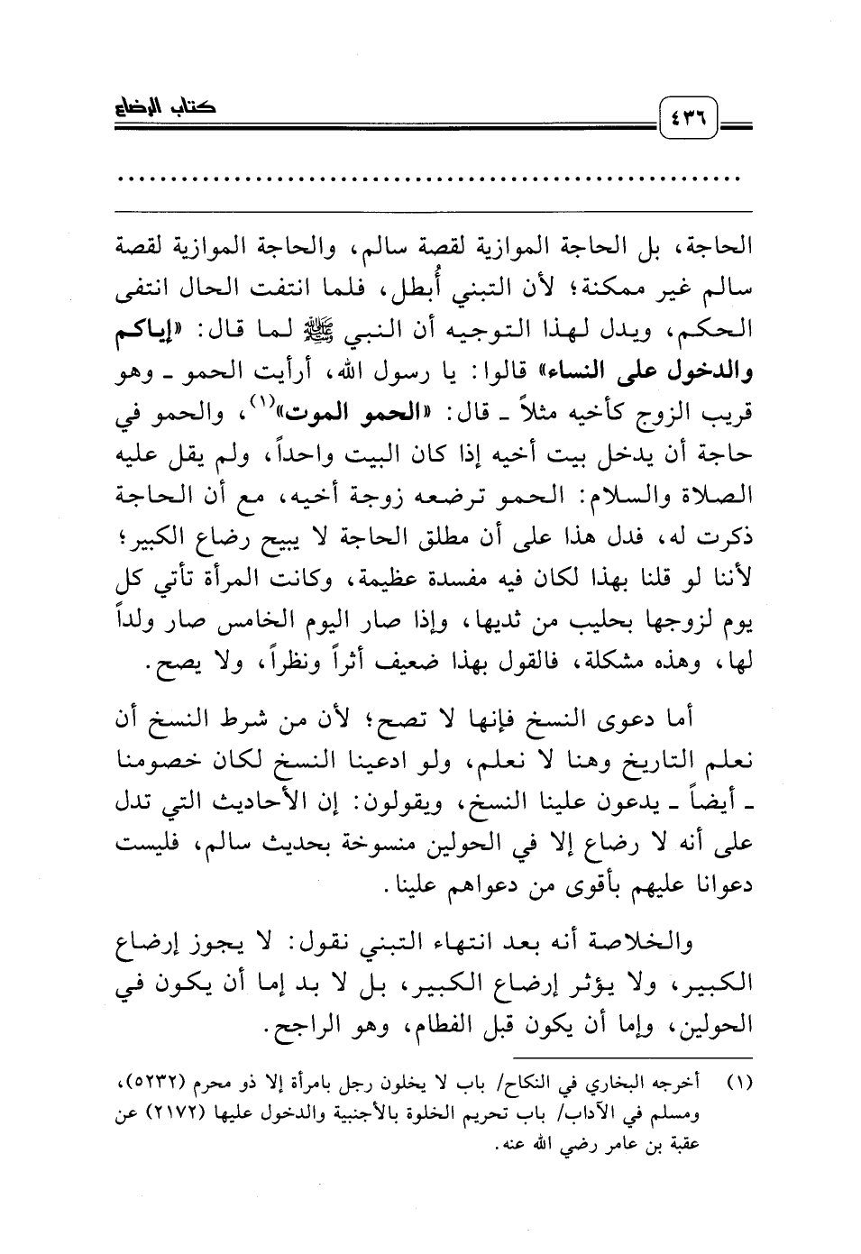 الحاجة، بل الحاجة الموازية لقصة سالم، والحاجة الموازية لقصة سالم غير ممكنة؛ لأن التبني أُبطل، فلما انتفت الحال انتفى الحكم، ويدل لهذا التوجيه أن النبي صلّى الله عليه وسلّم لما قال: «إياكم والدخول على النساء» قالوا: يا رسول الله، أرأيت الحمو ـ وهو قريب الزوج كأخيه مثلاً ـ قال: «الحمو الموت» (¬1)، والحمو في حاجة أن يدخل بيت أخيه إذا كان البيت واحداً، ولم يقل عليه الصلاة والسلام: الحمو ترضعه زوجة أخيه، مع أن الحاجة ذكرت له، فدل هذا على أن مطلق الحاجة لا يبيح رضاع الكبير؛ لأننا لو قلنا بهذا لكان فيه مفسدة عظيمة، وكانت المرأة تأتي كل يوم لزوجها بحليب من ثديها، وإذا صار اليوم الخامس صار ولداً لها، وهذه مشكلة، فالقول بهذا ضعيف أثراً ونظراً، ولا يصح.