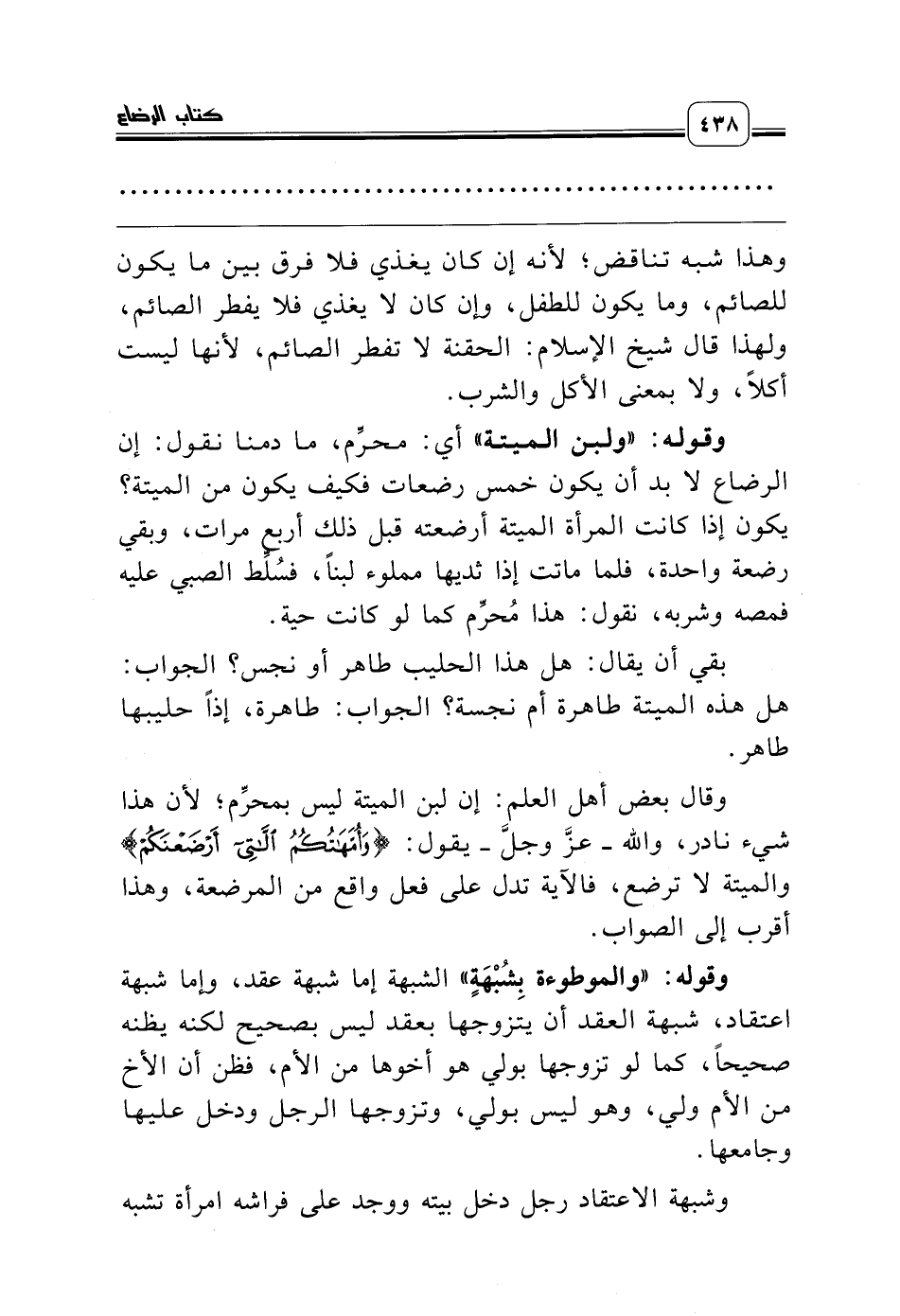 وقال بعض أهل العلم: إن لبن الميتة ليس بمحرِّم؛ لأن هذا شيء نادر، والله ـ عزّ وجل ـ يقول: {وَأُمَهَاتُكُمُ اللاَّتِي أَرْضَعْنَكُمْ} والميتة لا ترضع، فالآية تدل على فعل واقع من المرضعة، وهذا أقرب إلى الصواب.