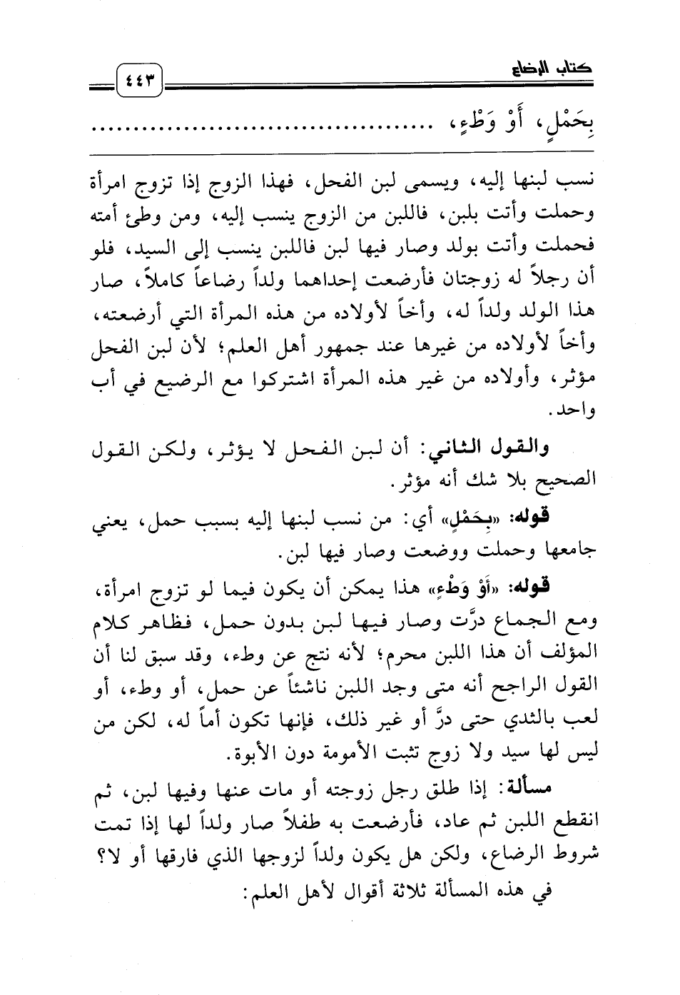 نسب لبنها إليه، ويسمى لبن الفحل، فهذا الزوج إذا تزوج امرأة وحملت وأتت بلبن، فاللبن من الزوج ينسب إليه، ومن وطئ أمته فحملت وأتت بولد وصار فيها لبن فاللبن ينسب إلى السيد، فلو أن رجلاً له زوجتان فأرضعت إحداهما ولداً رضاعاً كاملاً، صار هذا الولد ولداً له، وأخاً لأولاده من هذه المرأة التي أرضعته، وأخاً لأولاده من غيرها عند جمهور أهل العلم؛ لأن لبن الفحل مؤثر، وأولاده من غير هذه المرأة اشتركوا مع الرضيع في أب واحد.