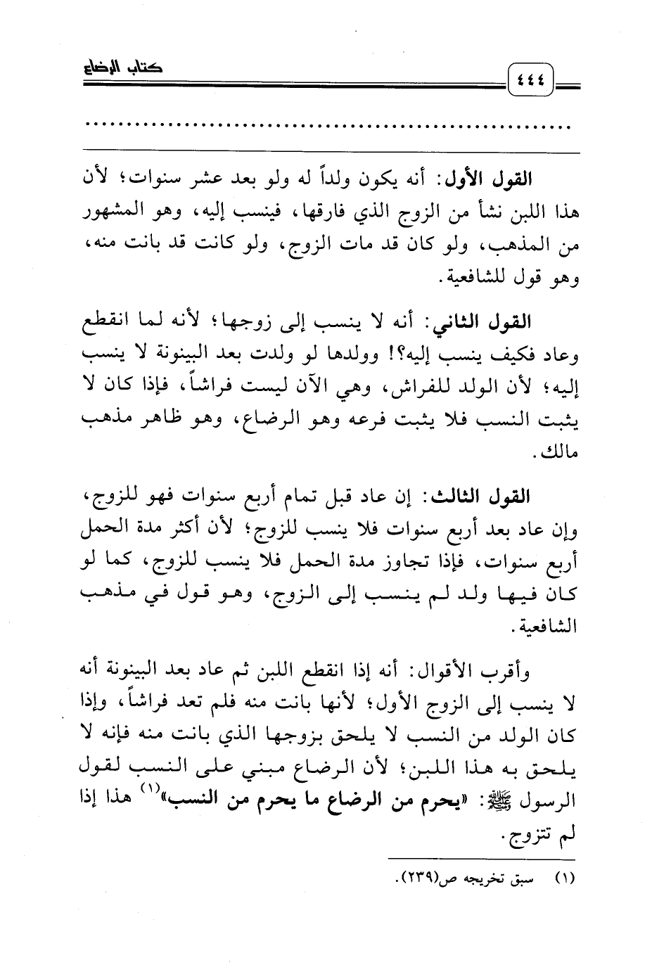 القول الأول: أنه يكون ولداً له ولو بعد عشر سنوات؛ لأن هذا اللبن نشأ من الزوج الذي فارقها، فينسب إليه، وهو المشهور من المذهب، ولو كان قد مات الزوج، ولو كانت قد بانت منه، وهو قول للشافعية.