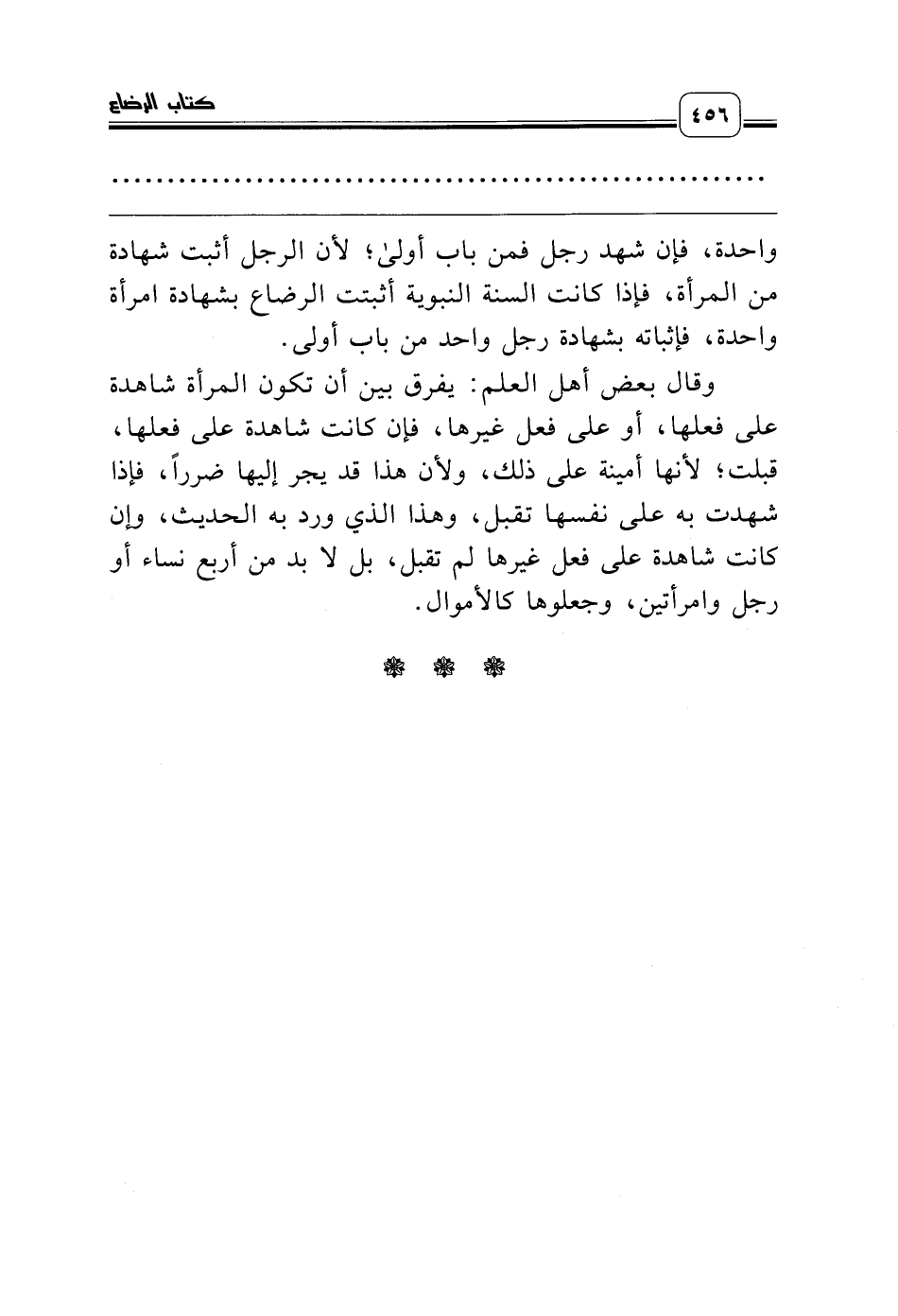 وقال بعض أهل العلم: يفرق بين أن تكون المرأة شاهدة على فعلها، أو على فعل غيرها، فإن كانت شاهدة على فعلها، قبلت؛ لأنها أمينة على ذلك، ولأن هذا قد يجر إليها ضرراً، فإذا شهدت به على نفسها تقبل، وهذا الذي ورد به الحديث، وإن كانت شاهدة على فعل غيرها لم تقبل، بل لا بد من أربع نساء أو رجل وامرأتين، وجعلوها كالأموال.