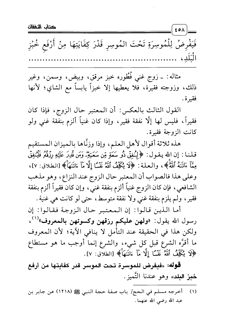 أما الذين قالوا: إن المعتبر حال الزوجة فقالوا: إن رسول الله يقول: «ولهن عليكم رزقهن وكسوتهن بالمعروف» (¬1)، ولكن هذا في الحقيقة عند التأمل لا ينافي الآية؛ لأن المعروف ما أقرَّه الشرع قبل كل شيء، والشرع إنما أوجب ما هو مستطاع {لاَ يُكَلِّفُ اللَّهُ نَفْسًا إِلاَّ مَا آتَاهَا} [الطلاق: 7].