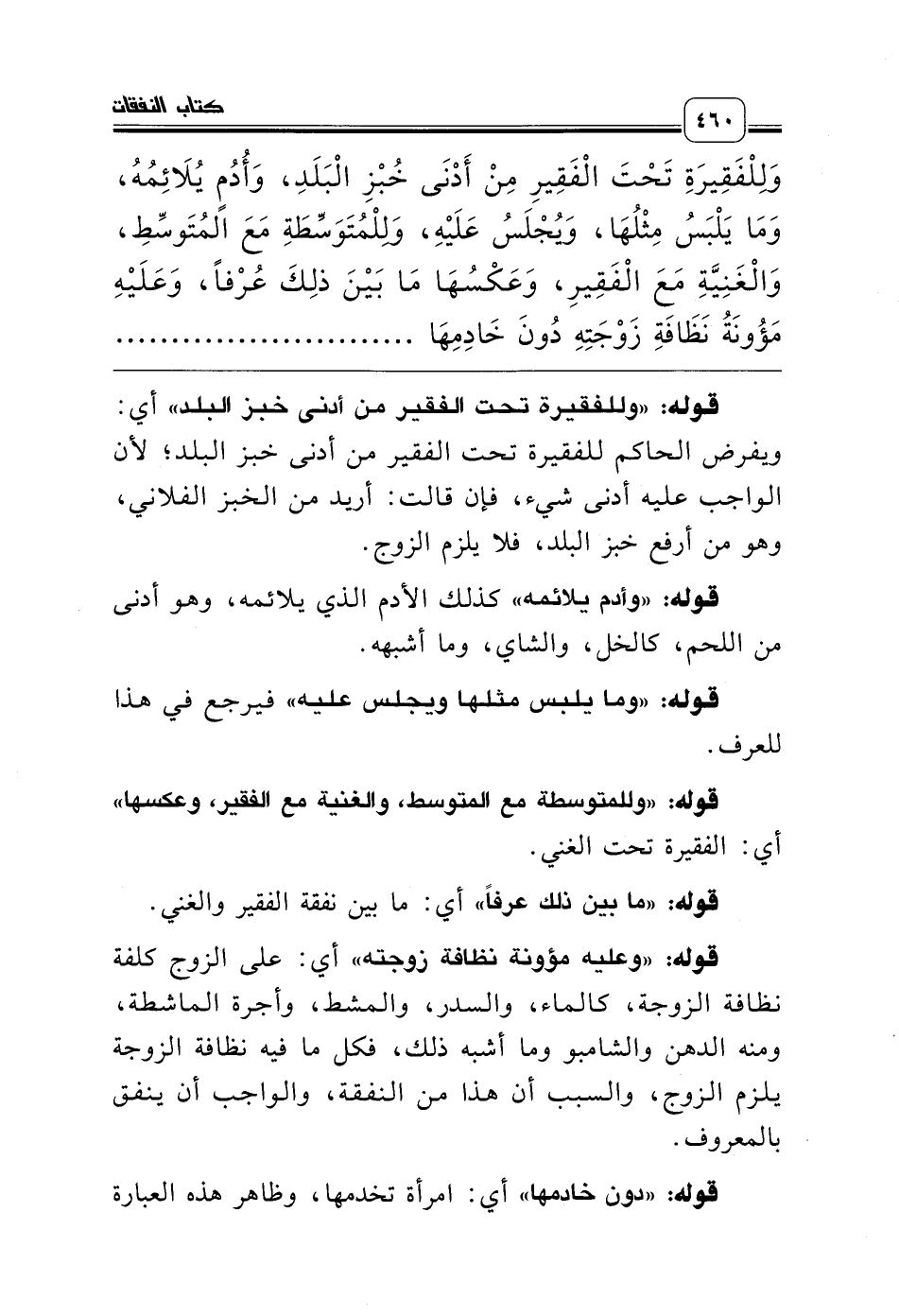 وَلِلْفَقِيرَةِ تَحْتَ الْفَقِيرِ مِنْ أَدْنَى خُبْزِ الْبَلَدِ، وَأُدُمٍ يُلاَئِمُهُ، وَمَا يَلْبَسُ مِثْلُهَا، وَيُجْلَسُ عَلَيْهِ، وَلِلْمُتَوَسِّطَةِ مَعَ المُتَوسِّطِ، وَالْغَنِيَّةِ مَعَ الْفَقِيرِ، وَعَكْسُهَا مَا بَيْنَ ذلِكَ عُرْفاً، وَعَلَيْهِ مَؤُونَةُ نَظَافَةِ زَوْجَتِهِ دُونَ خَادِمِهَا لاَ دَوَاءٌ، وَأُجْرَةُ طَبِيبٍ.