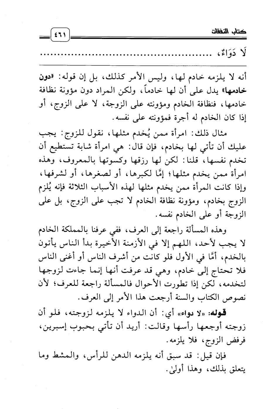 وهذه المسألة راجعة إلى العرف، ففي عرفنا بالمملكة الخادم لا يجب لأحد، اللهم إلا في الأزمنة الأخيرة بدأ الناس يأتون بالخدم، أمَّا في الأول فلو كانت من أشرف الناس أو أغنى الناس فلا تحتاج إلى خادم، وهي قد عرفت أنها إنما جاءت لزوجها لتخدمه، لكن إذا تطورت الأحوال فالمسألة راجعة للعرف؛ لأن نصوص الكتاب والسنة أرجعت هذا الأمر إلى العرف.