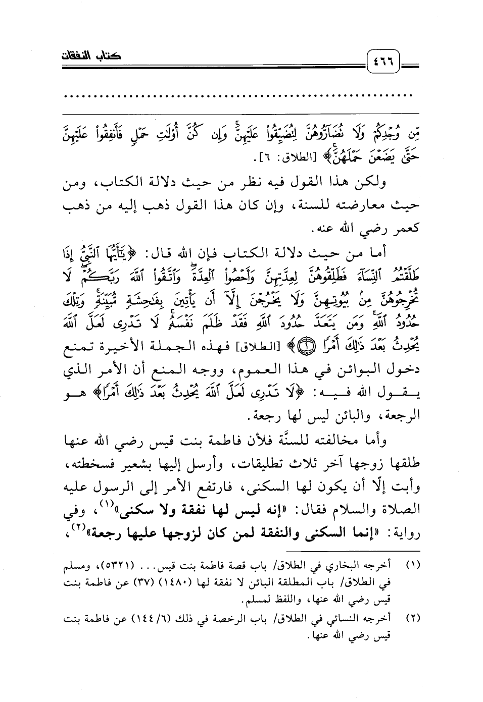 وأما مخالفته للسنَّة فلأن فاطمة بنت قيس رضي الله عنها طلقها زوجها آخر ثلاث تطليقات، وأرسل إليها بشعير فسخطته، وأبت إلاّ أن يكون لها السكنى، فارتفع الأمر إلى الرسول عليه الصلاة والسلام فقال: «إنه ليس لها نفقة ولا سكنى» (¬1)، وفي رواية: «إنما السكنى والنفقة لمن كان لزوجها عليها رجعة» (¬2)،