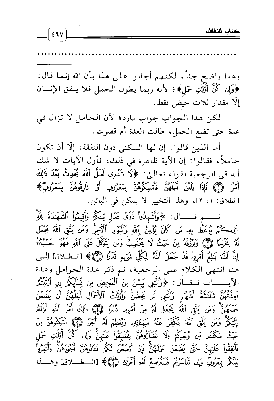 ثم قال: {وَأَشْهِدُوا ذَوَيْ عَدْلٍ مِنْكُمْ وَأَقِيمُوا الشَّهَادَةَ لِلَّهِ ذَلِكُمْ يُوعَظُ بِهِ مَنْ كَانَ يُؤْمِنُ بِاللَّهِ وَالْيَوْمِ الآخِرِ وَمَنْ يَتَّقِ اللَّهَ يَجْعَلْ لَهُ مَخْرَجًا} {وَيَرْزُقْهُ مِنْ حَيْثُ لاَ يَحْتَسِبُ وَمَنْ يَتَوَكَّلْ عَلَى اللَّهِ فَهُوَ حَسْبُهُ إِنَّ اللَّهَ بَالِغُ أَمْرِهِ قَدْ جَعَلَ اللَّهُ لِكُلِّ شَيْءٍ قَدْرًا *} [الطلاق] إلى هنا انتهى الكلام على الرجعية، ثم ذكر عدة الحوامل وعدة الآيسات فقال: {أَسْكِنُوهُنَّ مِنْ حَيْثُ سَكَنْتُمْ مِنْ وُجْدِكُمْ وَلاَ تُضَآرُّوهُنَّ لِتُضَيِّقُوا عَلَيْهِنَّ وَإِنْ كُنَّ أُولاَتِ حَمْلٍ فَأَنْفِقُوا عَلَيْهِنَّ} [الطلاق] وهذا
