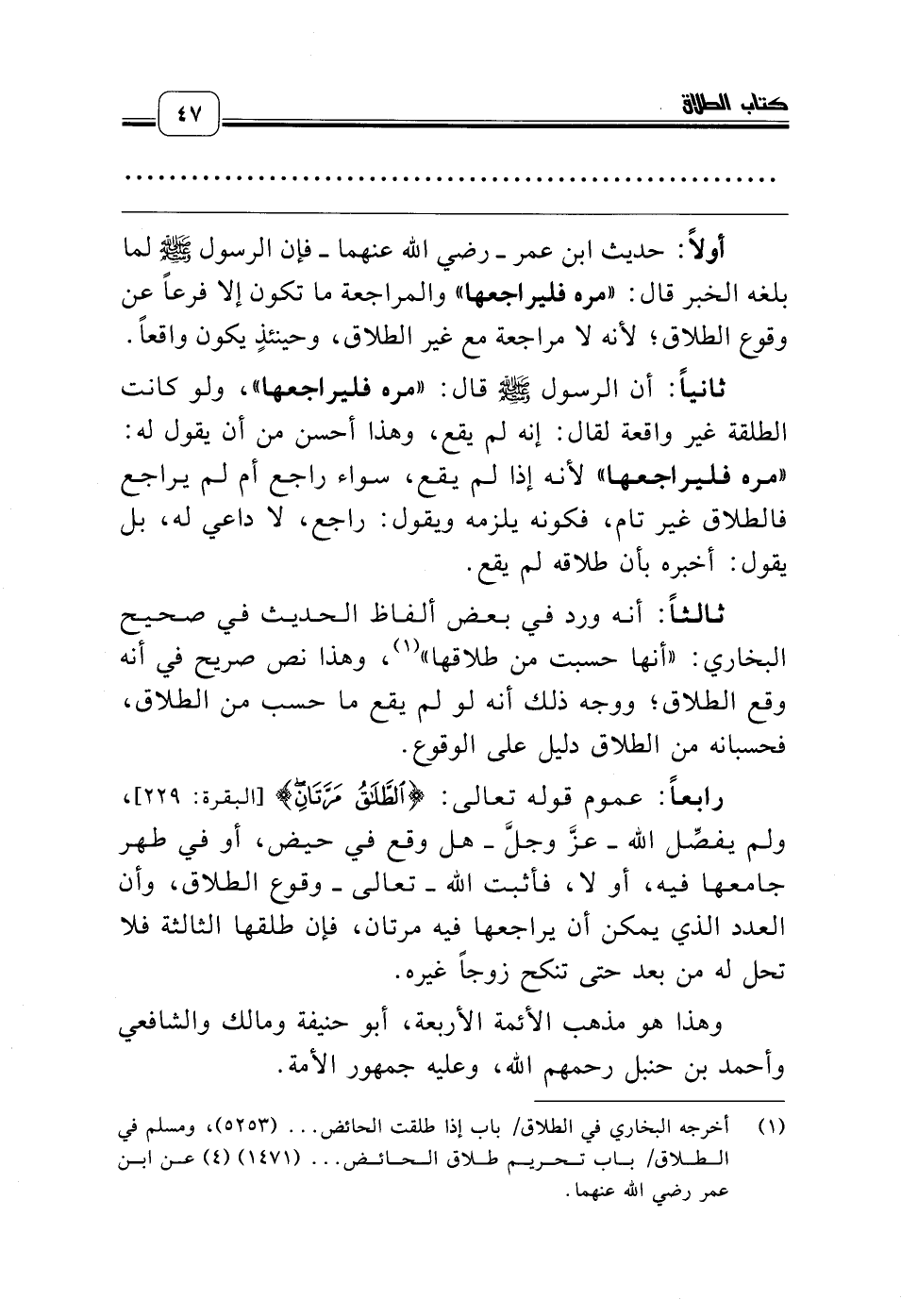 (¬1) أخرجه البخاري في الطلاق/ باب إذا طلقت الحائض ... (5253)، ومسلم في الطلاق/ باب تحريم طلاق الحائض ... (1471) (4) عن ابن عمر رضي الله عنهما.