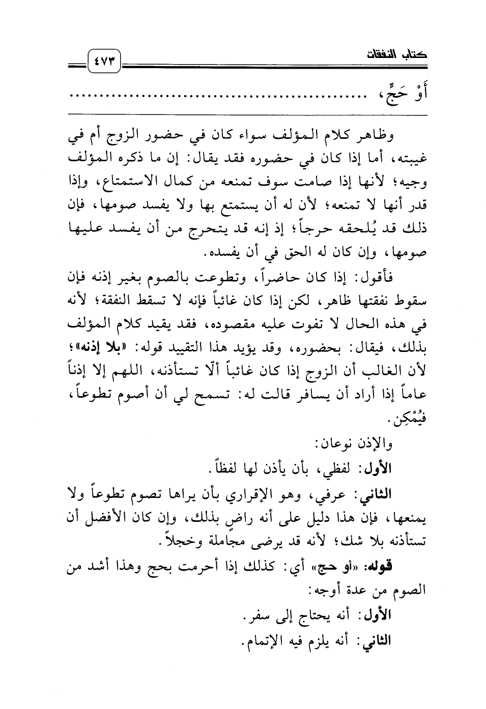 فأقول: إذا كان حاضراً، وتطوعت بالصوم بغير إذنه فإن سقوط نفقتها ظاهر، لكن إذا كان غائباً فإنه لا تسقط النفقة؛ لأنه في هذه الحال لا تفوت عليه مقصوده، فقد يقيد كلام المؤلف بذلك، فيقال: بحضوره، وقد يؤيد هذا التقييد قوله: «بلا إذنه»؛ لأن الغالب أن الزوج إذا كان غائباً ألاّ تستأذنه، اللهم إلا إذناً عاماً إذا أراد أن يسافر قالت له: تسمح لي أن أصوم تطوعاً، فيُمْكِن.