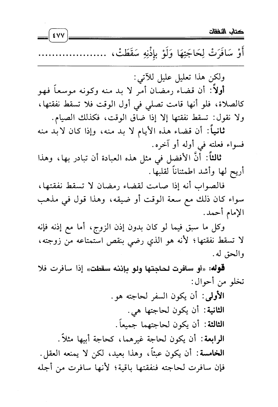 قوله: «أو سافرت لحاجتها ولو بإذنه سقطت» إذا سافرت فلا تخلو من أحوال: