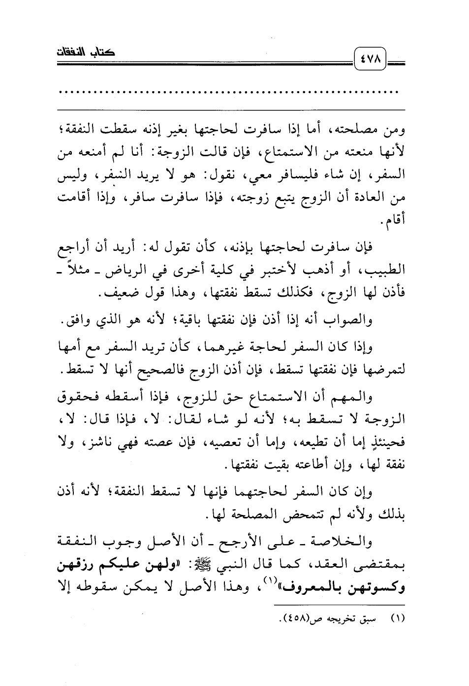 ومن مصلحته، أما إذا سافرت لحاجتها بغير إذنه سقطت النفقة؛ لأنها منعته من الاستمتاع، فإن قالت الزوجة: أنا لم أمنعه من السفر، إن شاء فليسافر معي، نقول: هو لا يريد السفر، وليس من العادة أن الزوج يتبع زوجته، فإذا سافرت سافر، وإذا أقامت أقام.