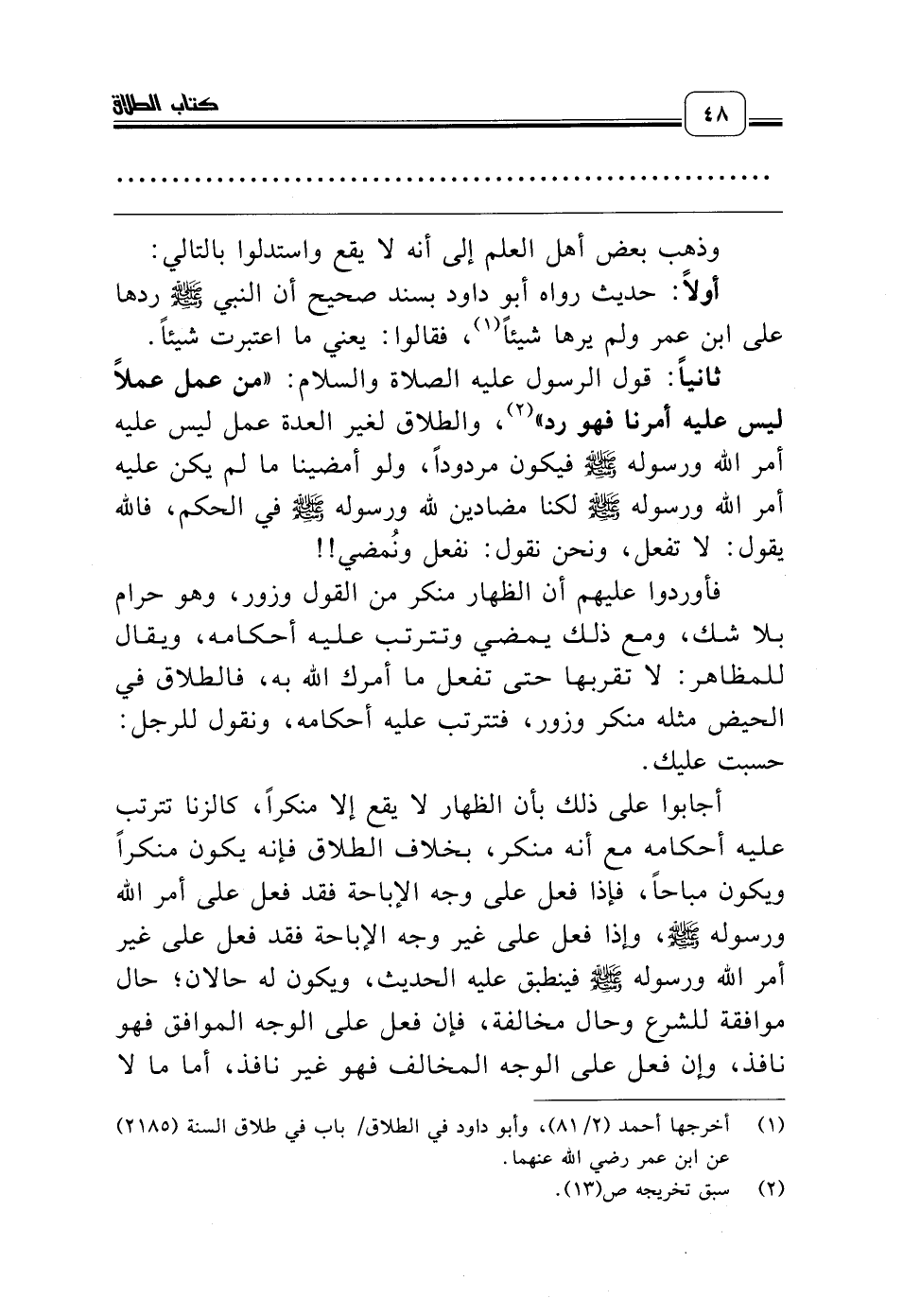 فأوردوا عليهم أن الظهار منكر من القول وزور، وهو حرام بلا شك، ومع ذلك يمضي وتترتب عليه أحكامه، ويقال للمظاهر: لا تقربها حتى تفعل ما أمرك الله به، فالطلاق في الحيض مثله منكر وزور، فتترتب عليه أحكامه، ونقول للرجل: حسبت عليك.
