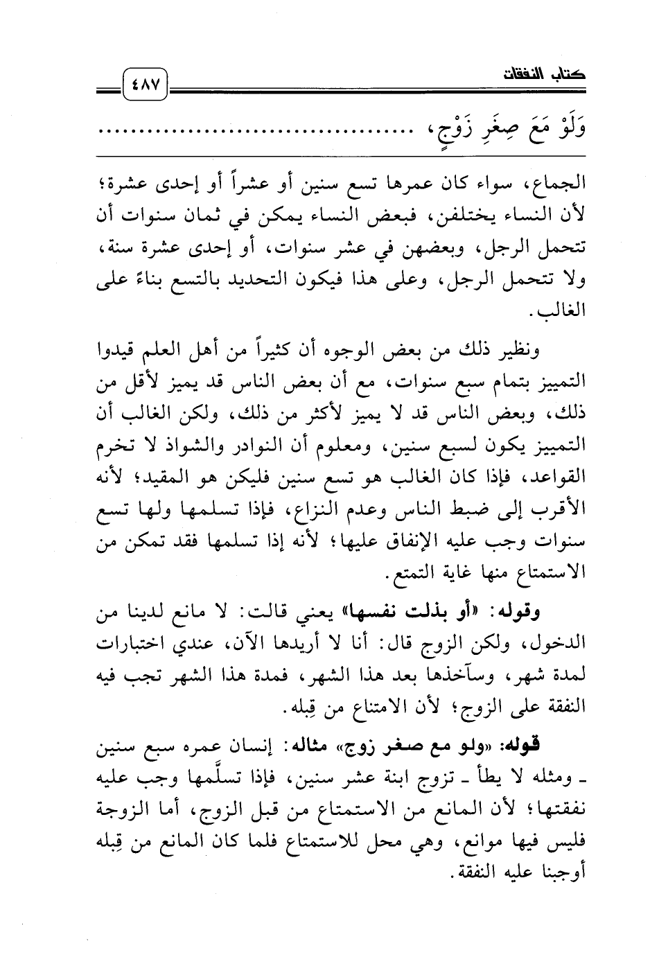 ونظير ذلك من بعض الوجوه أن كثيراً من أهل العلم قيدوا التمييز بتمام سبع سنوات، مع أن بعض الناس قد يميز لأقل من ذلك، وبعض الناس قد لا يميز لأكثر من ذلك، ولكن الغالب أن التمييز يكون لسبع سنين، ومعلوم أن النوادر والشواذ لا تخرم القواعد، فإذا كان الغالب هو تسع سنين فليكن هو المقيد؛ لأنه الأقرب إلى ضبط الناس وعدم النزاع، فإذا تسلمها ولها تسع سنوات وجب عليه الإنفاق عليها؛ لأنه إذا تسلمها فقد تمكن من الاستمتاع منها غاية التمتع.