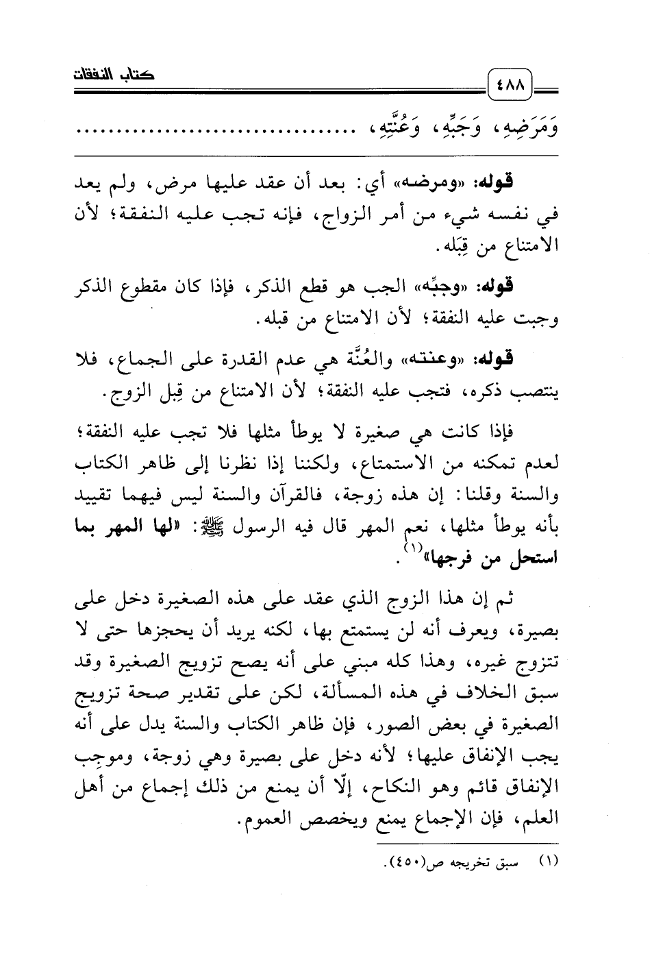 قوله: «وعنته» والعُنَّة هي عدم القدرة على الجماع، فلا ينتصب ذكره، فتجب عليه النفقة؛ لأن الامتناع من قِبل الزوج.