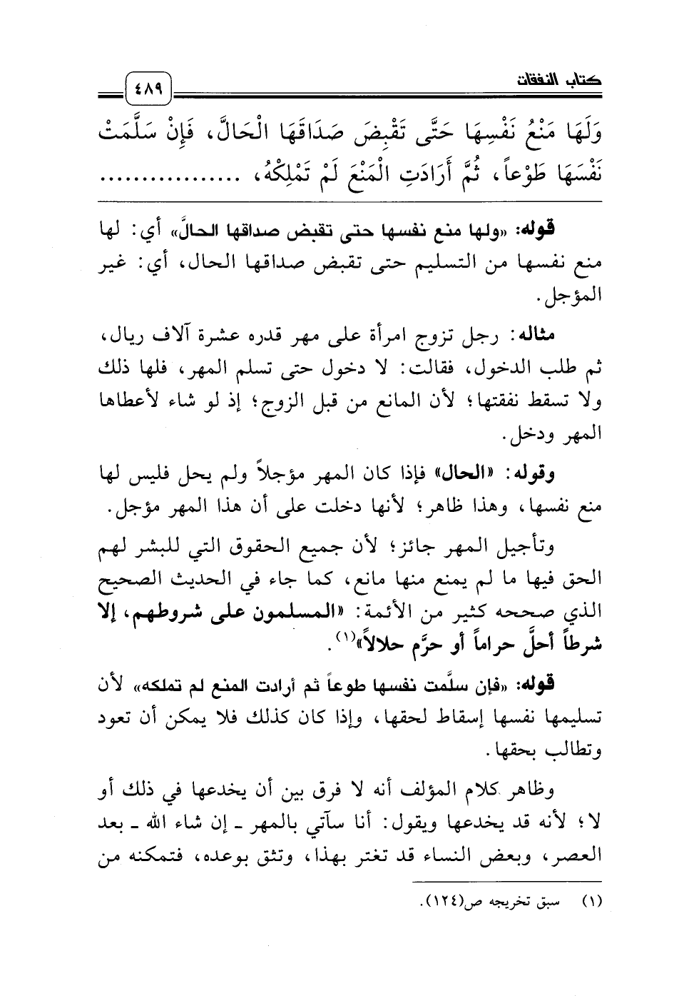 مثاله: رجل تزوج امرأة على مهر قدره عشرة آلاف ريال، ثم طلب الدخول، فقالت: لا دخول حتى تسلم المهر، فلها ذلك ولا تسقط نفقتها؛ لأن المانع من قبل الزوج؛ إذ لو شاء لأعطاها المهر ودخل.