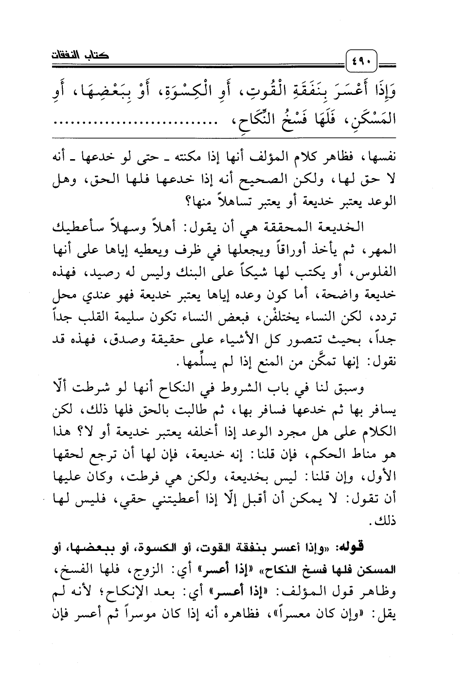 قوله: «وإذا أعسر بنفقة القوت، أو الكسوة، أو ببعضها، أو المسكن فلها فسخ النكاح» «إذا أعسر» أي: الزوج، فلها الفسخ، وظاهر قول المؤلف: «إذا أعسر» أي: بعد الإنكاح؛ لأنه لم يقل: «وإن كان معسراً»، فظاهره أنه إذا كان موسراً ثم أعسر فإن