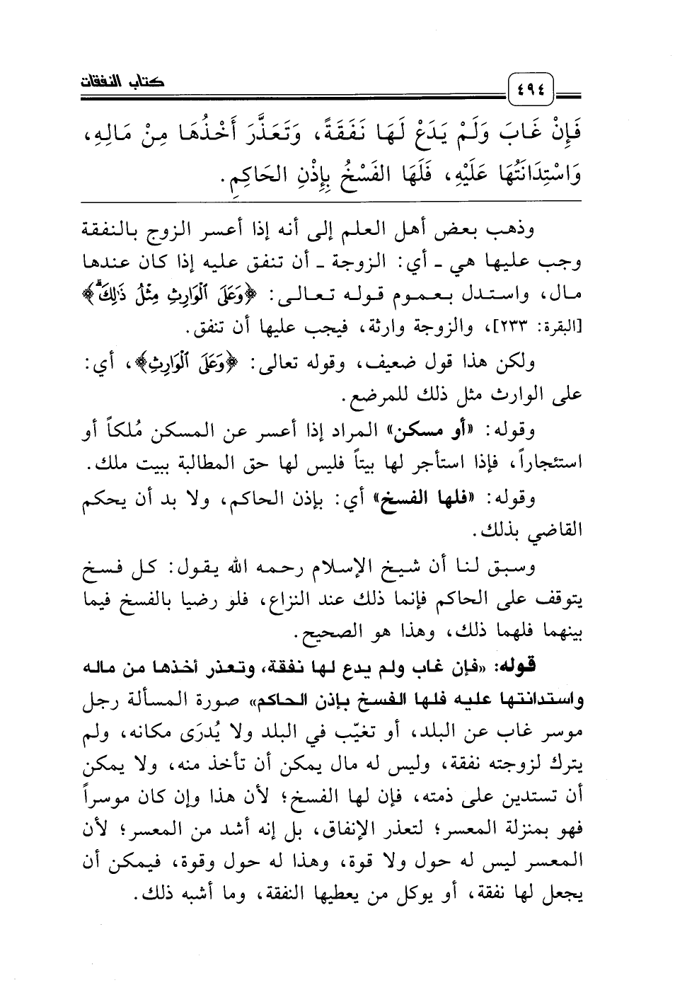 قوله: «فإن غاب ولم يدع لها نفقة، وتعذر أخذها من ماله واستدانتها عليه فلها الفسخ بإذن الحاكم» صورة المسألة رجل موسر غاب عن البلد، أو تغيّب في البلد ولا يُدرَى مكانه، ولم يترك لزوجته نفقة، وليس له مال يمكن أن تأخذ منه، ولا يمكن أن تستدين على ذمته، فإن لها الفسخ؛ لأن هذا وإن كان موسراً فهو بمنزلة المعسر؛ لتعذر الإنفاق، بل إنه أشد من المعسر؛ لأن المعسر ليس له حول ولا قوة، وهذا له حول وقوة، فيمكن أن يجعل لها نفقة، أو يوكل من يعطيها النفقة، وما أشبه ذلك.