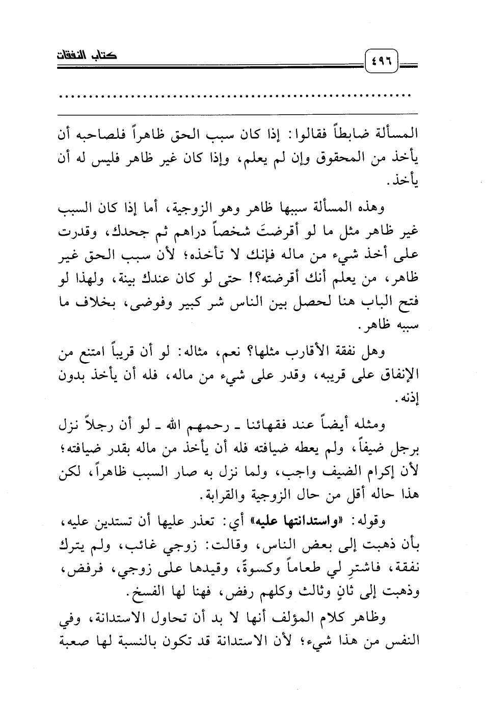 وهذه المسألة سببها ظاهر وهو الزوجية، أما إذا كان السبب غير ظاهر مثل ما لو أقرضتَ شخصاً دراهم ثم جحدك، وقدرت على أخذ شيء من ماله فإنك لا تأخذه؛ لأن سبب الحق غير ظاهر، من يعلم أنك أقرضته؟! حتى لو كان عندك بينة، ولهذا لو فتح الباب هنا لحصل بين الناس شر كبير وفوضى، بخلاف ما سببه ظاهر.