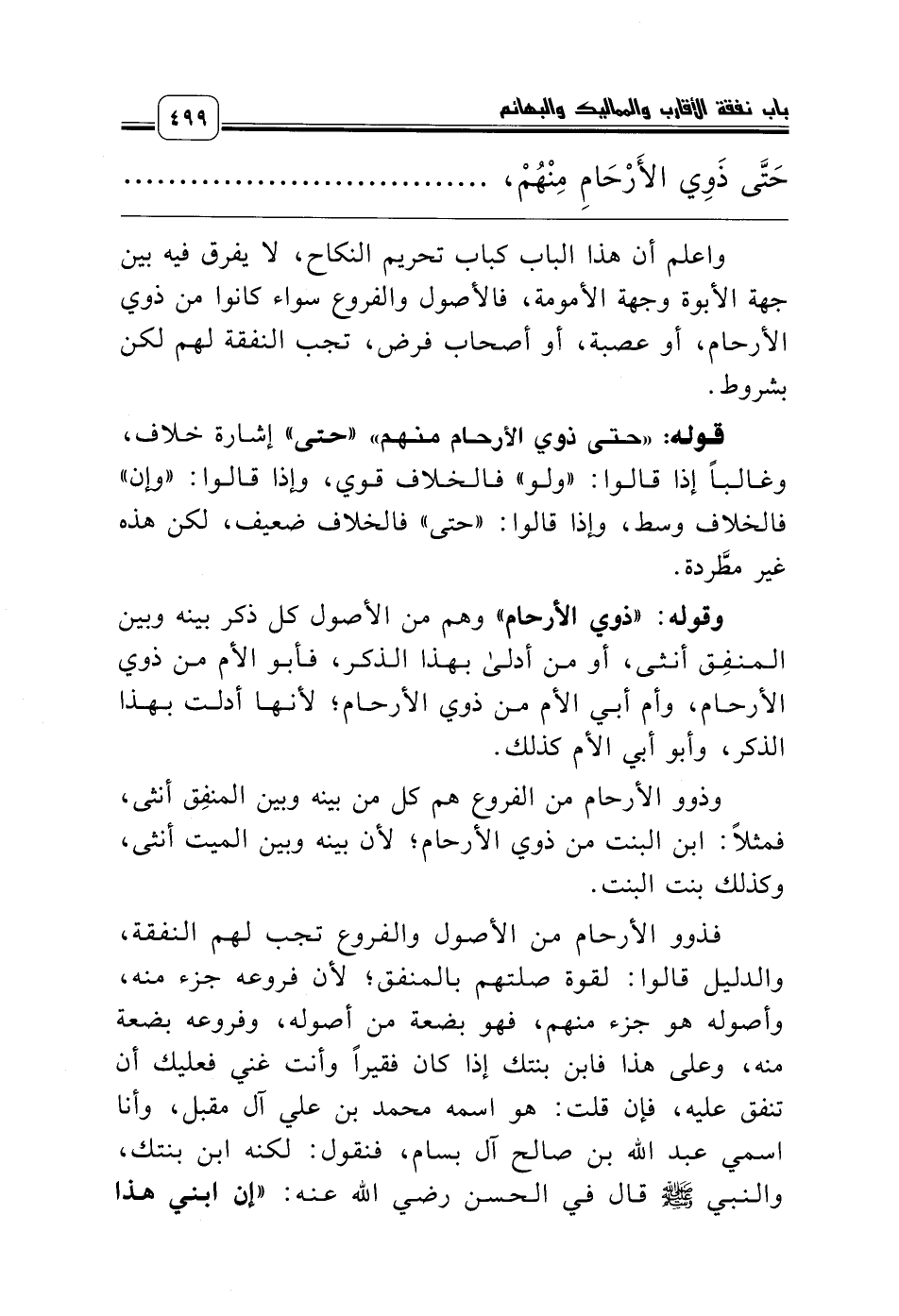 فذوو الأرحام من الأصول والفروع تجب لهم النفقة، والدليل قالوا: لقوة صلتهم بالمنفق؛ لأن فروعه جزء منه، وأصوله هو جزء منهم، فهو بضعة من أصوله، وفروعه بضعة منه، وعلى هذا فابن بنتك إذا كان فقيراً وأنت غني فعليك أن تنفق عليه، فإن قلت: هو اسمه محمد بن علي آل مقبل، وأنا اسمي عبد الله بن صالح آل بسام، فنقول: لكنه ابن بنتك، والنبي صلّى الله عليه وسلّم قال في الحسن رضي الله عنه: «إن ابني هذا