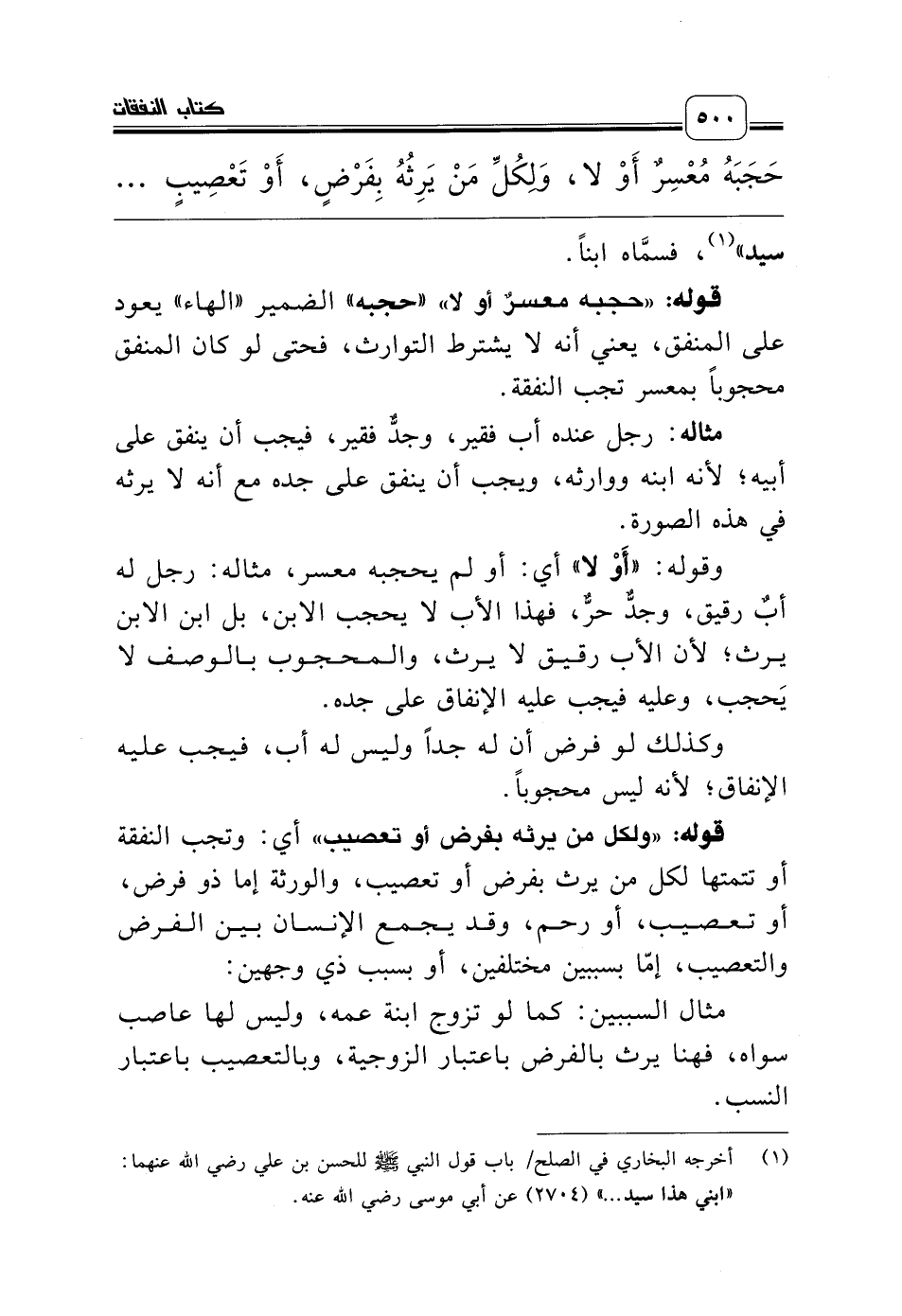 قوله: «حجبه معسرٌ أو لا» «حجبه» الضمير «الهاء» يعود على المنفق، يعني أنه لا يشترط التوارث، فحتى لو كان المنفق محجوباً بمعسر تجب النفقة.