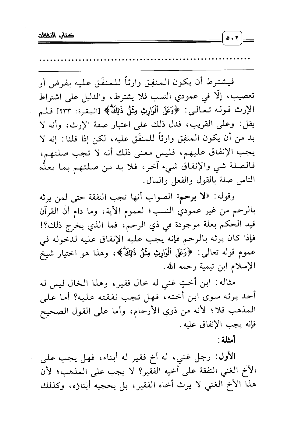 وقوله: «لا برحم» الصواب أنها تجب النفقة حتى لمن يرثه بالرحم من غير عمودي النسب؛ لعموم الآية، وما دام أن القرآن قيد الحكم بعلة موجودة في ذي الرحم، فما الذي يخرج ذلك؟! فإذا كان يرثه بالرحم فإنه يجب عليه الإنفاق عليه لدخوله في عموم قوله تعالى: {وَعَلَى الْوَارِثِ مِثْلُ ذَلِكَ}، وهذا هو اختيار شيخ الإسلام ابن تيمية رحمه الله.