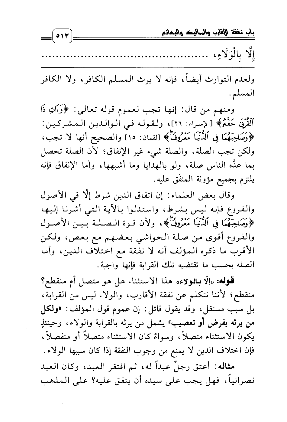 وقال بعض العلماء: إن اتفاق الدين شرط إلاّ في الأصول والفروع فإنه ليس بشرط، واستدلوا بالآية التي أشرنا إليها {وَصَاحِبْهُمَا فِي الدُّنْيَا مَعْرُوفًا}، ولأن قوة الصلة بين الأصول والفروع أقوى من صلة الحواشي بعضهم مع بعض، ولكن الأقرب ما ذكره المؤلف أنه لا نفقة مع اختلاف الدين، وأما الصلة بحسب ما تقتضيه تلك القرابة فإنها واجبة.