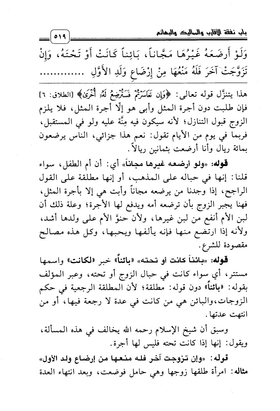 قوله: «ولو أرضعه غيرها مجاناً» أي: أن أم الطفل، سواء قلنا: إنها في حباله على المذهب، أو إنها مطلقة على القول الراجح، إذا وجدنا من يرضعه مجاناً وأبت هي إلا بأجرة المثل، فهنا يجبر الزوج بأن ترضعه أمه ويدفع لها الأجرة؛ وعلة ذلك أن لبن الأم أنفع من لبن غيرها، ولأن حنوَّ الأم على ولدها أشد، ولأنه إذا ارتضع منها فإنه يألفها ويحبها، وكل هذه مصالح مقصودة للشرع.