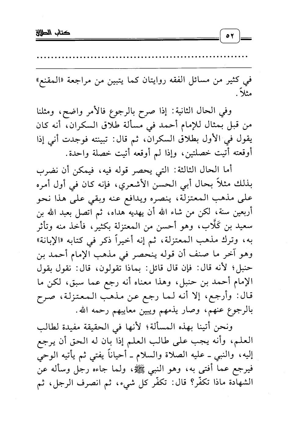 أما الحال الثالثة: التي يحصر قوله فيه، فيمكن أن نضرب بذلك مثلاً بحال أبي الحسن الأشعري، فإنه كان في أول أمره على مذهب المعتزلة، ينصره ويدافع عنه وبقي على هذا نحو أربعين سنة، لكن من شاء الله أن يهديه هداه، ثم اتصل بعبد الله بن سعيد بن كَلاَّب، وهو أحسن من المعتزلة بكثير، فأخذ منه وتأثر به، وترك مذهب المعتزلة، ثم إنه أخيراً ذكر في كتابه «الإبانة» وهو آخر ما صنف أن قوله ينحصر في مذهب الإمام أحمد بن حنبل؛ لأنه قال: فإن قال قائل: بماذا تقولون، قال: نقول بقول الإمام أحمد بن حنبل، وهذا معناه أنه رجع عما سبق، لكن ما قال: وأرجع، إلا أنه لما رجع عن مذهب المعتزلة، صرح بالرجوع عنهم، وصار يذمهم ويبين معايبهم رحمه الله.