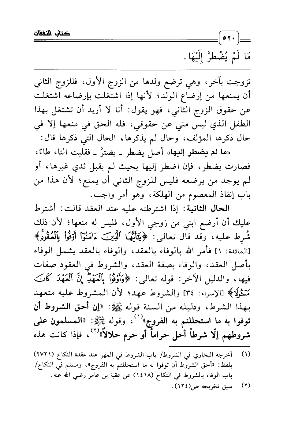 الحال الثانية: إذا اشترطته عليه عند العقد قالت: أشترط عليك أن أرضع ابني من زوجي الأول، فليس له منعها؛ لأن ذلك شُرِط عليه، وقد قال تعالى: {يَاأَيُّهَا الَّذِينَ آمَنُوا أَوْفُوا بِالْعُقُودِ} [المائدة: 1] فأمر الله بالوفاء بالعقد، والوفاء بالعقد يشمل الوفاء بأصل العقد، والوفاء بصفة العقد، والشروط في العقود صفات فيها، والدليل الآخر: قوله تعالى: {وَأَوْفُوا بِالْعَهْدِ إِنَّ الْعَهْدَ كَانَ مَسْؤُولاً} [الإسراء: 34] والشروط عهد؛ لأن المشروط عليه متعهد بهذا الشرط، ودليله من السنة قوله صلّى الله عليه وسلّم: «إن أحق الشروط أن توفوا به ما استحللتم به الفروج» (¬1)، وقوله صلّى الله عليه وسلّم: «المسلمون على شروطهم إلاّ شرطاً أحل حراماً أو حرم حلالاً» (¬2)، فإذا كانت هذه
