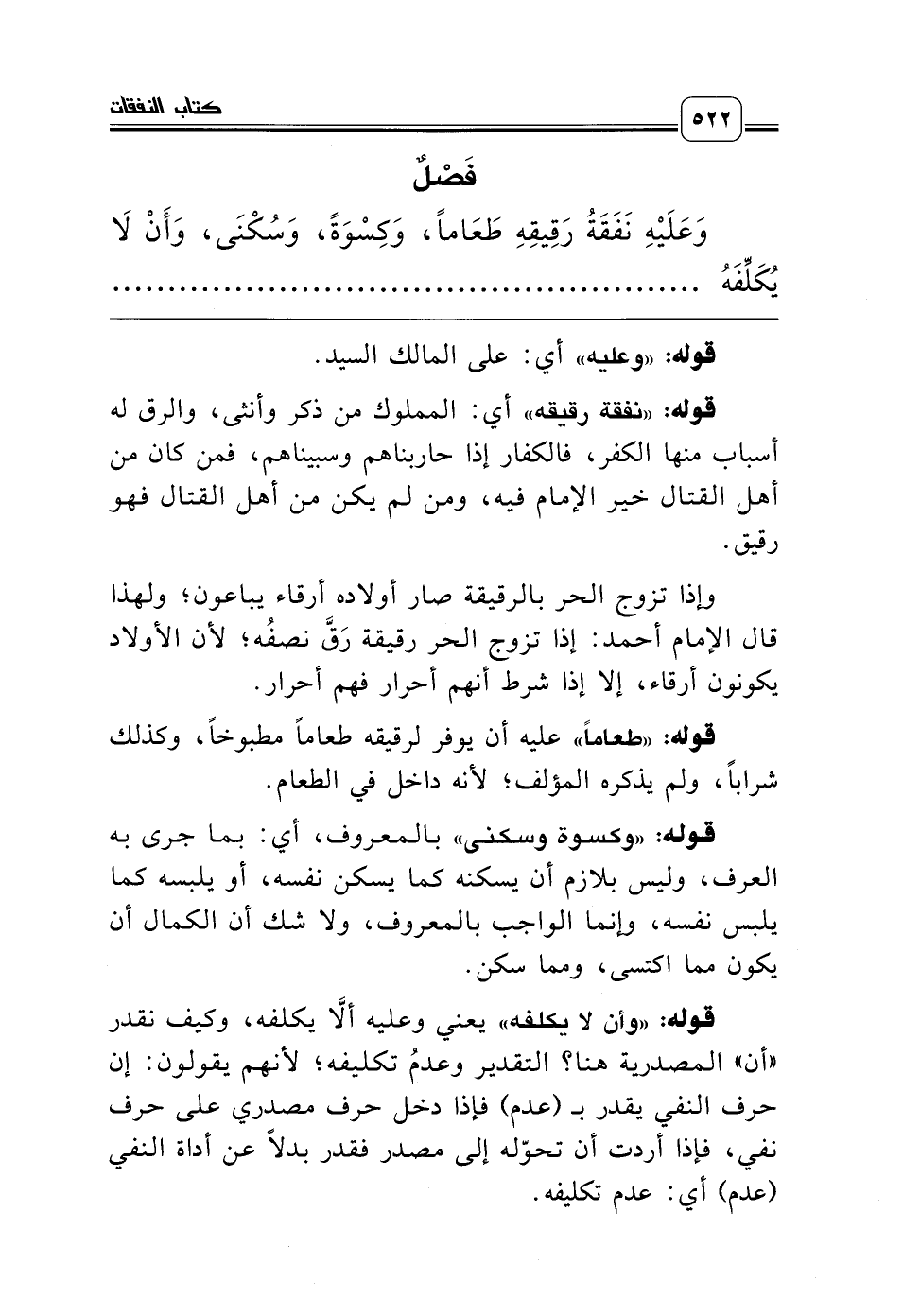 وَعَلَيْهِ نَفَقَةُ رَقِيقِهِ طَعَاماً، وَكِسْوَةً، وَسُكْنَى، وَأَنْ لاَ يُكَلِّفَهُ مُشِقّاً كَثِيراً، وَإِنِ اِتَّفَقَا عَلَى المُخَارَجَةِ جَازَ، وَيُريحُهُ وَقْتَ الْقَائِلَةِ، وَالنَّوْمِ، وَالصَّلاَةِ، وَيُرْكِبُهُ في السَّفَر عُقْبَةً، وَإِنْ طَلَبَ نِكَاحاً زَوَّجَهُ، أَوْ بَاعَهُ، وَإِنْ طَلَبَتْهُ أَمَةٌ وَطِئَهَا، أَوْ زَوَّجَهَا، أَوْ بَاعَهَا.
