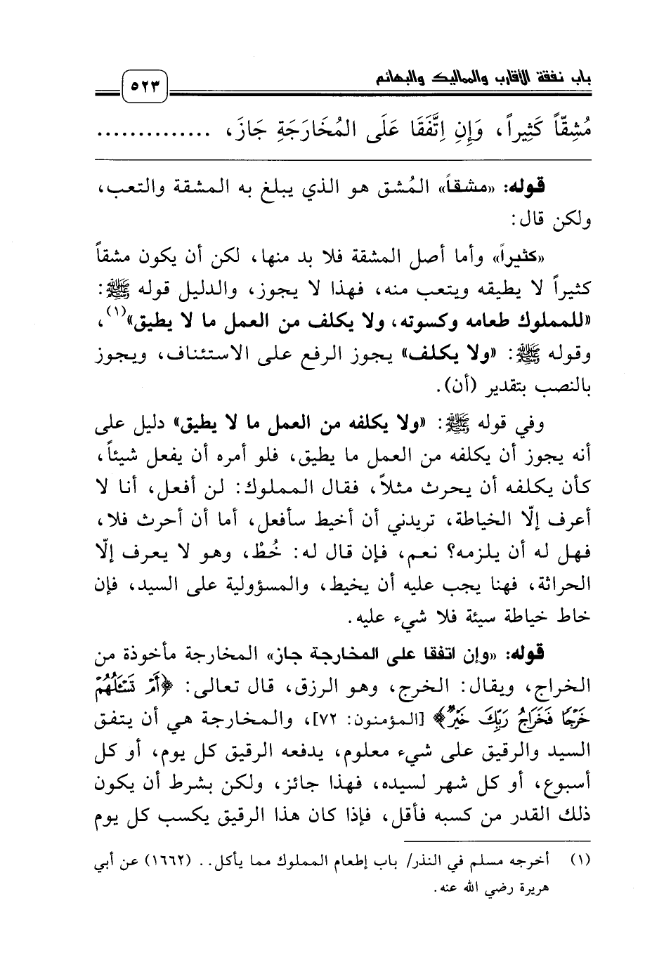 «كثيراً» وأما أصل المشقة فلا بد منها، لكن أن يكون مشقاً كثيراً لا يطيقه ويتعب منه، فهذا لا يجوز، والدليل قوله صلّى الله عليه وسلّم: «للمملوك طعامه وكسوته، ولا يكلف من العمل ما لا يطيق» (¬1)، وقوله صلّى الله عليه وسلّم: «ولا يكلف» يجوز الرفع على الاستئناف، ويجوز بالنصب بتقدير (أن).