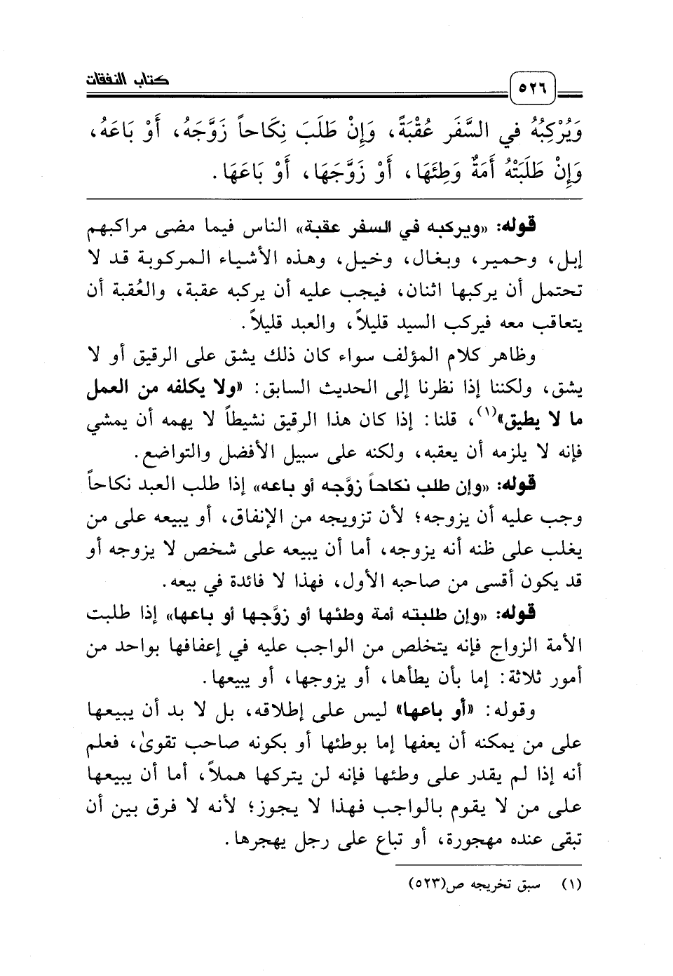 قوله: «ويركبه في السفر عقبة» الناس فيما مضى مراكبهم إبل، وحمير، وبغال، وخيل، وهذه الأشياء المركوبة قد لا تحتمل أن يركبها اثنان، فيجب عليه أن يركبه عقبة، والعُقبة أن يتعاقب معه فيركب السيد قليلاً، والعبد قليلاً.