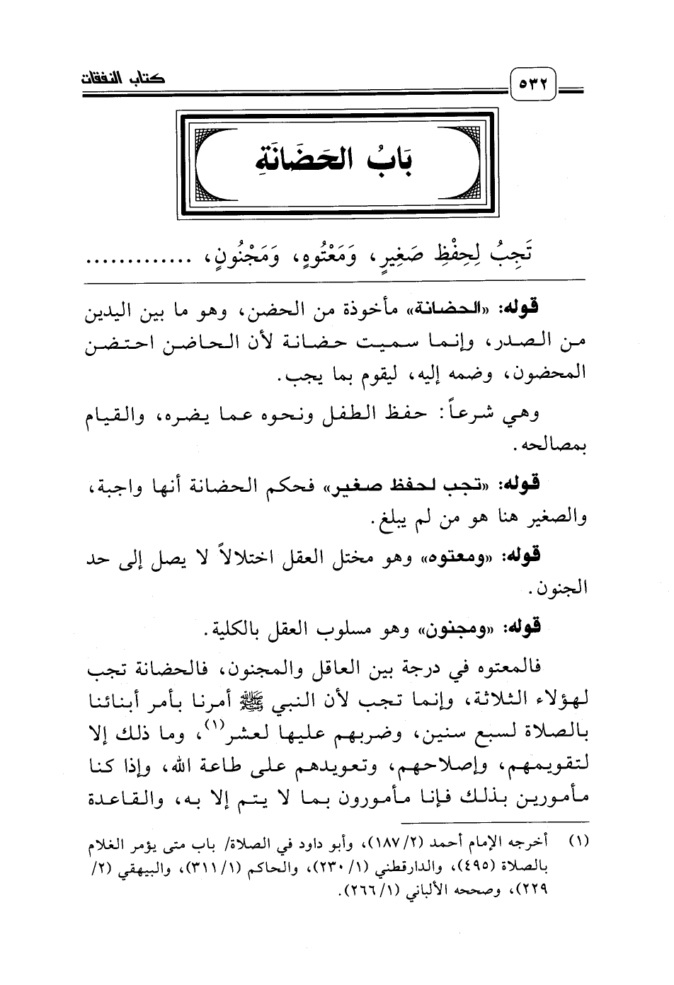 فالمعتوه في درجة بين العاقل والمجنون، فالحضانة تجب لهؤلاء الثلاثة، وإنما تجب لأن النبي صلّى الله عليه وسلّم أمرنا بأمر أبنائنا بالصلاة لسبع سنين، وضربهم عليها لعشر (¬1)، وما ذلك إلا لتقويمهم، وإصلاحهم، وتعويدهم على طاعة الله، وإذا كنا مأمورين بذلك فإنا مأمورون بما لا يتم إلا به، والقاعدة