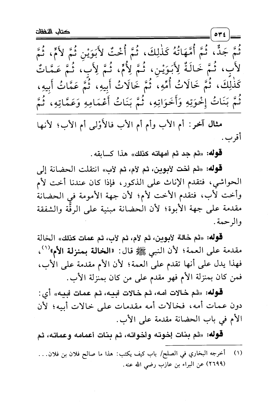 قوله: «ثم خالة لأبوين، ثم لأم، ثم لأب، ثم عمات كذلك» الخالة مقدمة على العمة؛ لأن النبي صلّى الله عليه وسلّم قال: «الخالة بمنزلة الأم» (¬1)، فهذا يدل على أنها تقدم على العمة؛ لأن الأم مقدمة على الأب، فمن كان بمنزلة الأم فهو مقدم على من كان بمنزلة الأب.