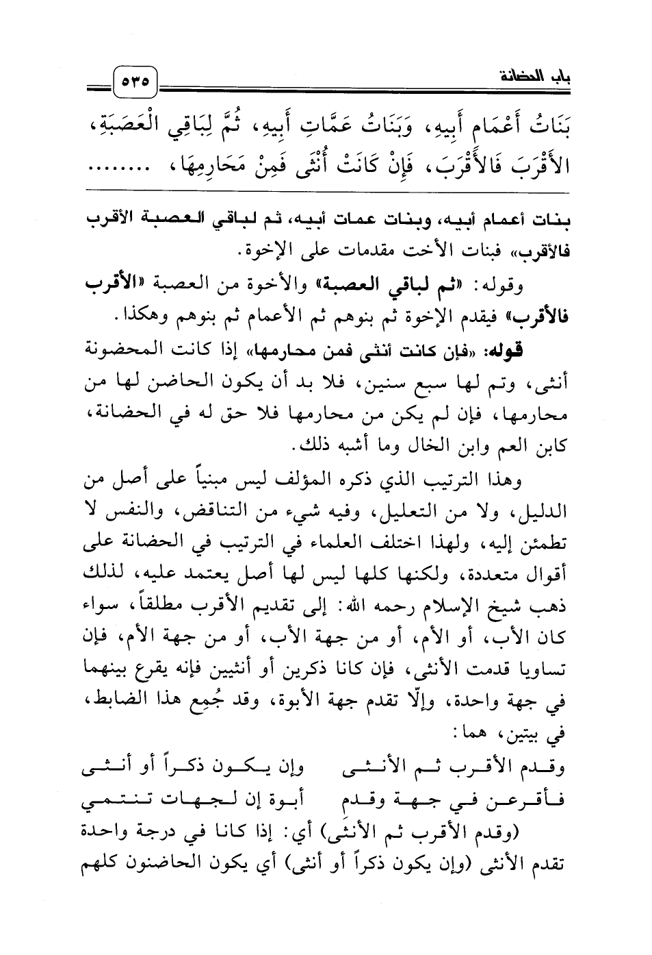 وهذا الترتيب الذي ذكره المؤلف ليس مبنياً على أصل من الدليل، ولا من التعليل، وفيه شيء من التناقض، والنفس لا تطمئن إليه، ولهذا اختلف العلماء في الترتيب في الحضانة على أقوال متعددة، ولكنها كلها ليس لها أصل يعتمد عليه، لذلك ذهب شيخ الإسلام رحمه الله: إلى تقديم الأقرب مطلقاً، سواء كان الأب، أو الأم، أو من جهة الأب، أو من جهة الأم، فإن تساويا قدمت الأنثى، فإن كانا ذكرين أو أنثيين فإنه يقرع بينهما في جهة واحدة، وإلاّ تقدم جهة الأبوة، وقد جُمِع هذا الضابط، في بيتين، هما: