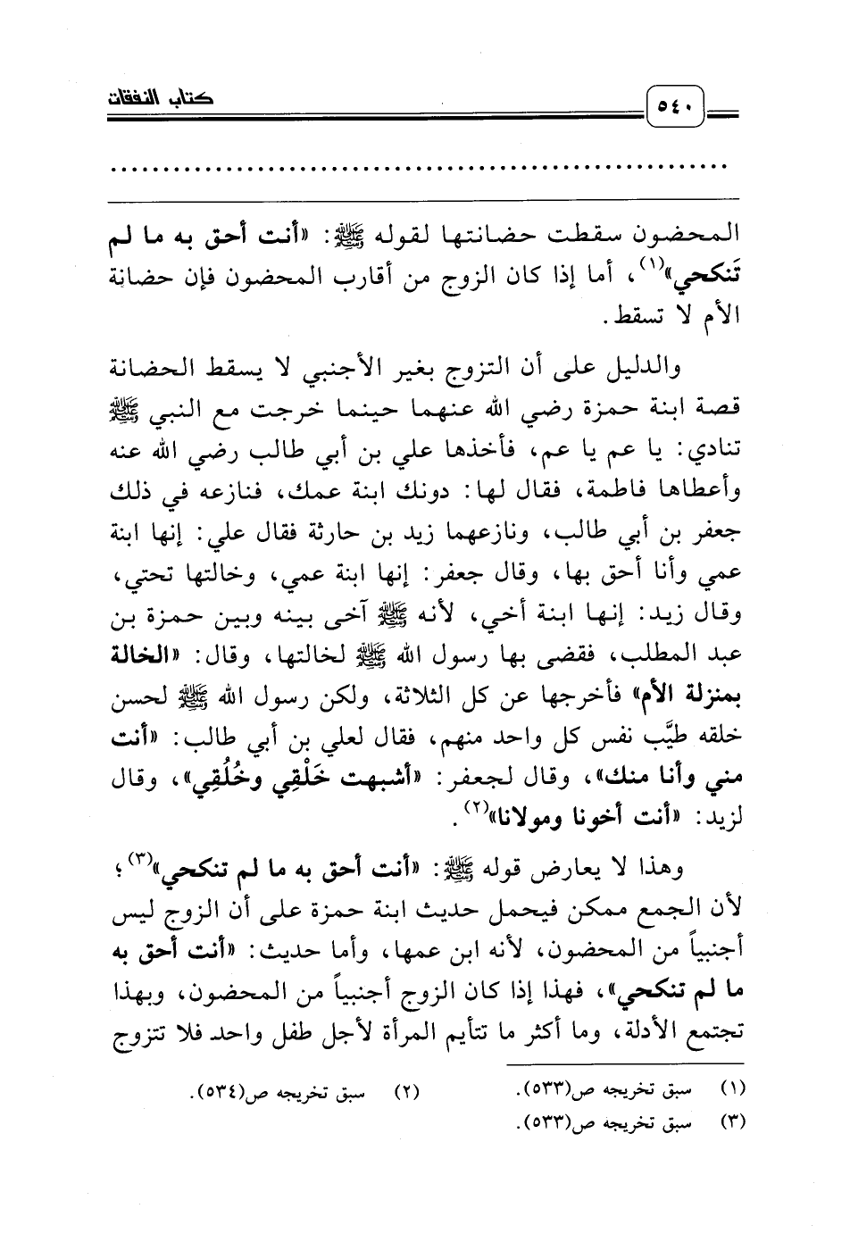 وهذا لا يعارض قوله صلّى الله عليه وسلّم: «أنت أحق به ما لم تنكحي» (¬3)؛ لأن الجمع ممكن فيحمل حديث ابنة حمزة على أن الزوج ليس أجنبياً من المحضون، لأنه ابن عمها، وأما حديث: «أنت أحق به ما لم تنكحي»، فهذا إذا كان الزوج أجنبياً من المحضون، وبهذا تجتمع الأدلة، وما أكثر ما تتأيم المرأة لأجل طفل واحدـ فلا تتزوج