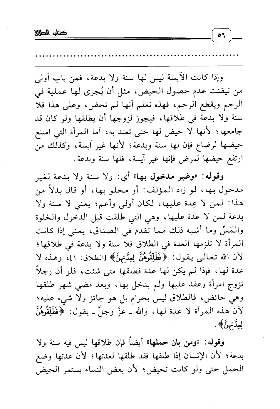 وقوله: «وغير مدخول بها» أي: ولا سنة ولا بدعة لغير مدخول بها، لو زاد المؤلف: أو مخلو بها، أو قال بدلاً من هذا: لمن لا عِدة عليها، لكان أولى وأعم؛ يعني لا سنة ولا بدعة لمن لا عدة عليها، وهي التي طلقت قبل الدخول والخلوة والمَسِّ وما أشبه ذلك مما تقدم في الصداق، يعني إذا كانت المرأة لا تلزمها العدة في الطلاق فلا سنة ولا بدعة في طلاقها؛ لأن الله تعالى يقول: {فَطَلِّقُوهُنَّ لِعِدَّتِهِنَّ} [الطلاق: 1]، وهذه لا عدة لها، فإذا لم يكن لها عدة فطلقها متى شئت، فلو أن رجلاً تزوج امرأة وعقد عليها ولم يدخل بها، وبعد مضي شهر طلقها وهي حائض، فالطلاق ليس بحرام بل هو جائز ولا شيء عليه؛ لأن هذه المرأة لا عدة لها، والله ـ عزّ وجل ـ يقول: {فَطَلِّقُوهُنَّ لِعِدَّتِهِنَّ}.