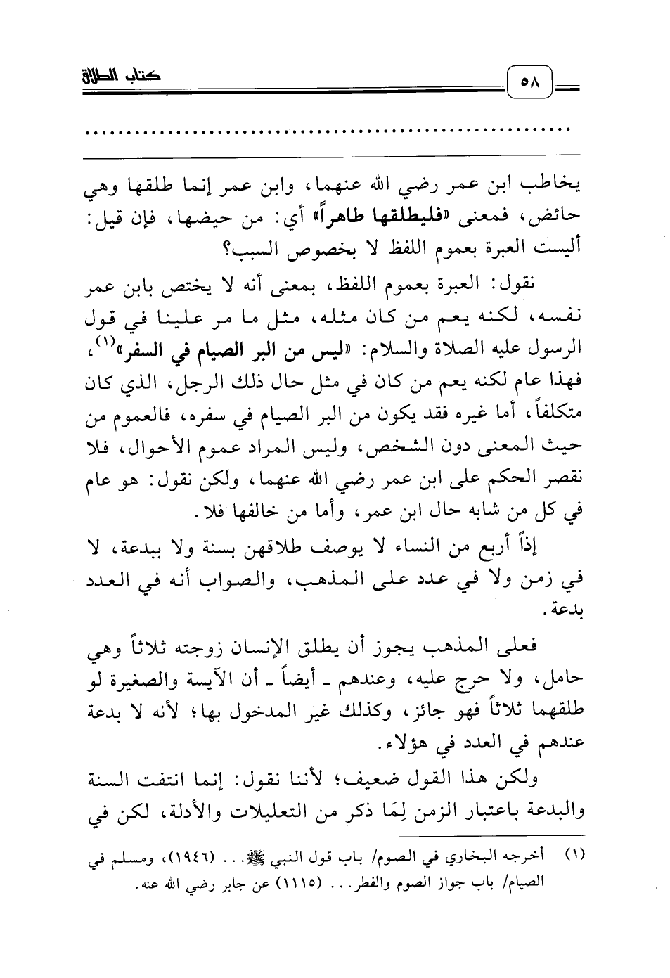 نقول: العبرة بعموم اللفظ، بمعنى أنه لا يختص بابن عمر نفسه، لكنه يعم من كان مثله، مثل ما مر علينا في قول الرسول عليه الصلاة والسلام: «ليس من البر الصيام في السفر» (¬1)، فهذا عام لكنه يعم من كان في مثل حال ذلك الرجل، الذي كان متكلفاً، أما غيره فقد يكون من البر الصيام في سفره، فالعموم من حيث المعنى دون الشخص، وليس المراد عموم الأحوال، فلا نقصر الحكم على ابن عمر رضي الله عنهما، ولكن نقول: هو عام في كل من شابه حال ابن عمر، وأما من خالفها فلا.