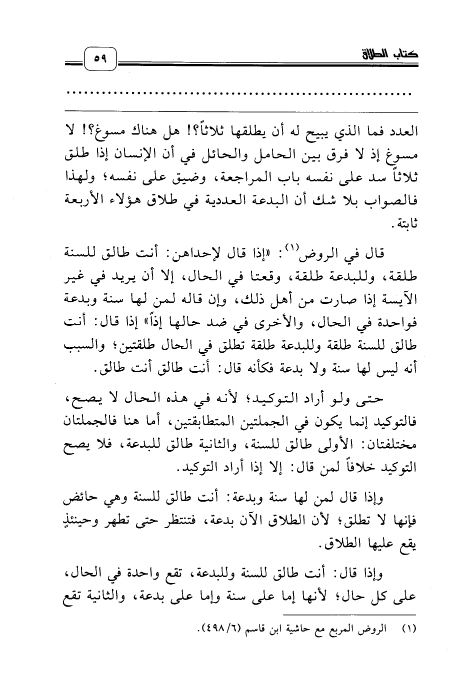 العدد فما الذي يبيح له أن يطلقها ثلاثاً؟! هل هناك مسوغ؟! لا مسوغ إذ لا فرق بين الحامل والحائل في أن الإنسان إذا طلق ثلاثاً سد على نفسه باب المراجعة، وضيق على نفسه؛ ولهذا فالصواب بلا شك أن البدعة العددية في طلاق هؤلاء الأربعة ثابتة.