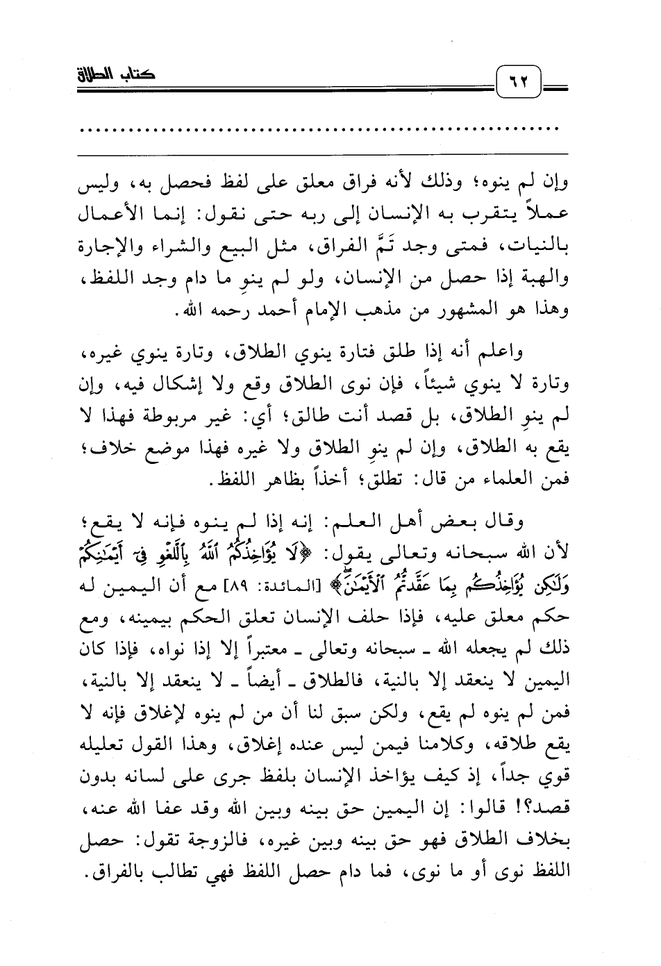 وقال بعض أهل العلم: إنه إذا لم ينوه فإنه لا يقع؛ لأن الله سبحانه وتعالى يقول: {لاَ يُؤَاخِذُكُمُ اللَّهُ بِاللَّغْوِ فِي أَيْمَانِكُمْ وَلَكِنْ يُؤَاخِذُكُمْ بِمَا عَقَّدْتُّمُ الأَيْمَانَ} [المائدة: 89] مع أن اليمين له حكم معلق عليه، فإذا حلف الإنسان تعلق الحكم بيمينه، ومع ذلك لم يجعله الله ـ سبحانه وتعالى ـ معتبراً إلا إذا نواه، فإذا كان اليمين لا ينعقد إلا بالنية، فالطلاق ـ أيضاً ـ لا ينعقد إلا بالنية، فمن لم ينوه لم يقع، ولكن سبق لنا أن من لم ينوه لإغلاق فإنه لا يقع طلاقه، وكلامنا فيمن ليس عنده إغلاق، وهذا القول تعليله قوي جداً، إذ كيف يؤاخذ الإنسان بلفظ جرى على لسانه بدون قصد؟! قالوا: إن اليمين حق بينه وبين الله وقد عفا الله عنه، بخلاف الطلاق فهو حق بينه وبين غيره، فالزوجة تقول: حصل اللفظ نوى أو ما نوى، فما دام حصل اللفظ فهي تطالب بالفراق.