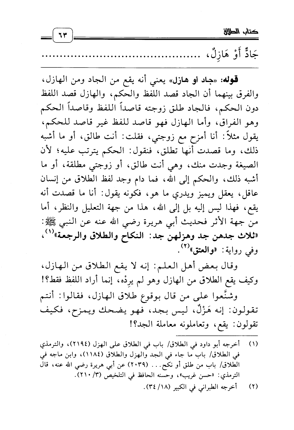 (¬1) أخرجه أبو داود في الطلاق/ باب في الطلاق على الهزل (2194)، والترمذي في الطلاق/ باب ما جاء في الجد والهزل والطلاق (1184)، وابن ماجه في الطلاق/ باب من طلق أو نكح ... (2039) عن أبي هريرة رضي الله عنه، قال الترمذي: «حسن غريب»، وحسنه الحافظ في التلخيص (3/ 210).